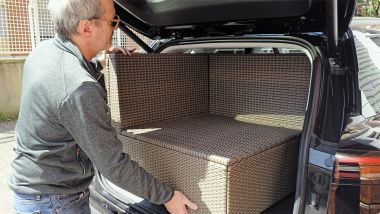 Il divano angolare per esterni in tre pezzi, 5 sedute totali, è entrato senza sforzo, con l’aiuto del portellone elettrico, del piano di carico allineato alla soglia e dei comandi per reclinare gli schienali facilmente raggiungibili.