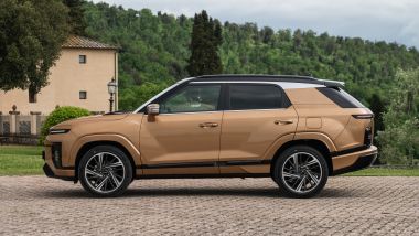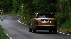 Pulita e geometrica la fiancata, dagli sbalzi lunghi, i passaruota angolari in tinta, grandi cerchi in lega da 20 pollici con taglio a diamante, parabrezza e lunotto ''coricati'', ma linea del tetto parallela al suolo. Ecco perché non è un SUV coupé.