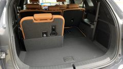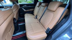 Ma le novità più grosse sono in abitacolo. Detto dei sette posti – l’ultima fila un po’ sacrificata, ma utile – trovo una ospitality di bordo a cinque stelle. Ci sono rivestimenti in pelle Nappa trapuntata per i sedili (che sono regolabili, climatizzabili elettricamente e con funzione massaggio), oltre allo scamosciato sulla plancia. Impunture a contrasto, selettore della velocità retroilluminato, accenti in alluminio spazzolato e luci ambiente che creano un’area benessere dove rilassarsi viaggiando. Niente da dire, qua, il livello appare lo stesso delle più blasonate, e costose, rivali europee. E di spazio a bordo ce n’è in abbondanza, ovvio. In quasi cinque metri stanno comodi tutti, con il divanetto posteriore che può anche essere spsotato avanti o indietro. Inoltre, l’abitacolo è super luminoso grazie al tetto panoramico in vetro. Il bagagliaio, poi, sembra una piazza d’armi dove sistemare tutto il necessario grazie a un volume che va da 235 a 940 a 1.655 litri.