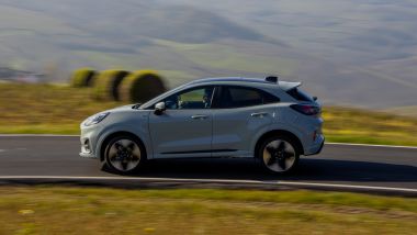 Il listino di nuova Ford Puma parte da 27.500 euro con motore da 125 CV e cambio manuale, che diventano 30.500 euro se volete 155 CV e cambio automatico come sull'auto in prova. Il nostro allestimento ST Line X parte da 33.500 euro, ma offre tanto di serie. Per esempio, i fari full LED, i sedili sportivi, l’infotainment da 12” con audio Bang & Olufsen, il portellone elettrico e la retrocamera. Si pagano a parte la guida autonoma di livello 2, che aggiunge 1.250 euro, i fari Matrix Full LED da 1.000 euro, il tetto apribile da 1.250 euro e alcune altre dotazioni che portano il prezzo della nostra Puma a 38.750 euro escluse promozioni. Ma a quel punto la versione ST da 170 CV ha già di serie guida autonoma e cerchi da 19'', ha un look e sedili molto più cool e brucia lo 0-100 km/h in 7,4''. Fanno 37.000 euro, signò... che faccio, lascio?
