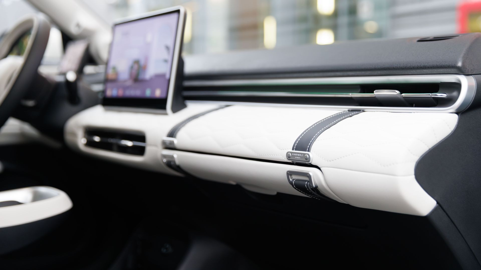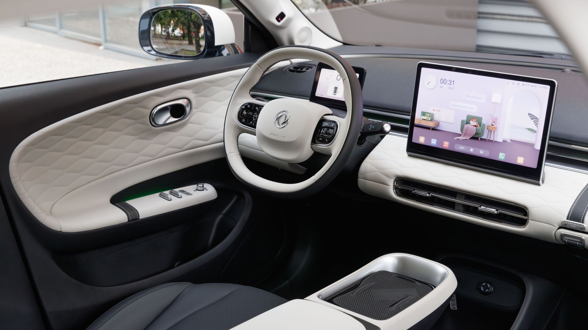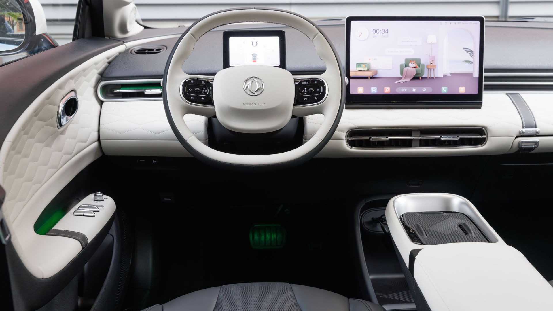 Gli interni sono rifiniti in similpelle trapuntata, con dettagli premium come luci ambient, display da 12 pollici e portiere senza cornice.