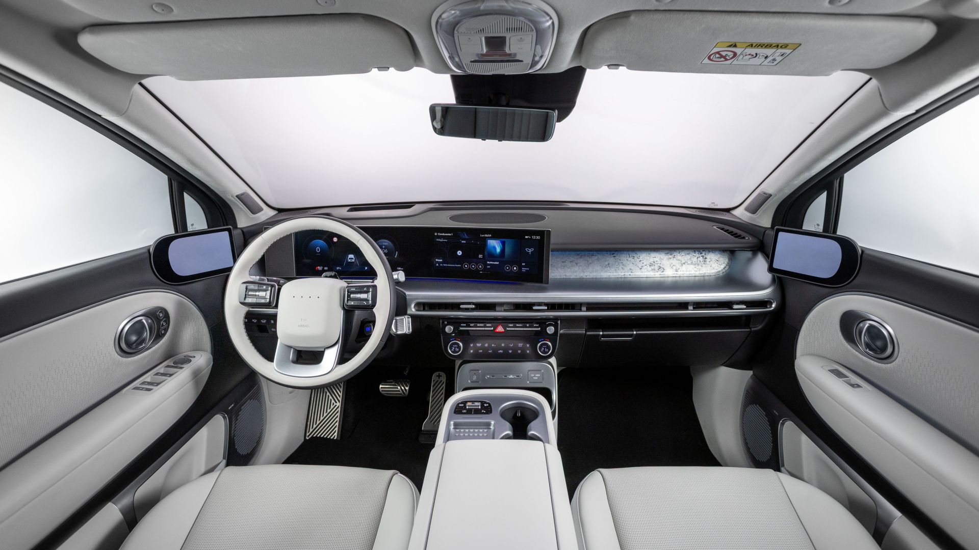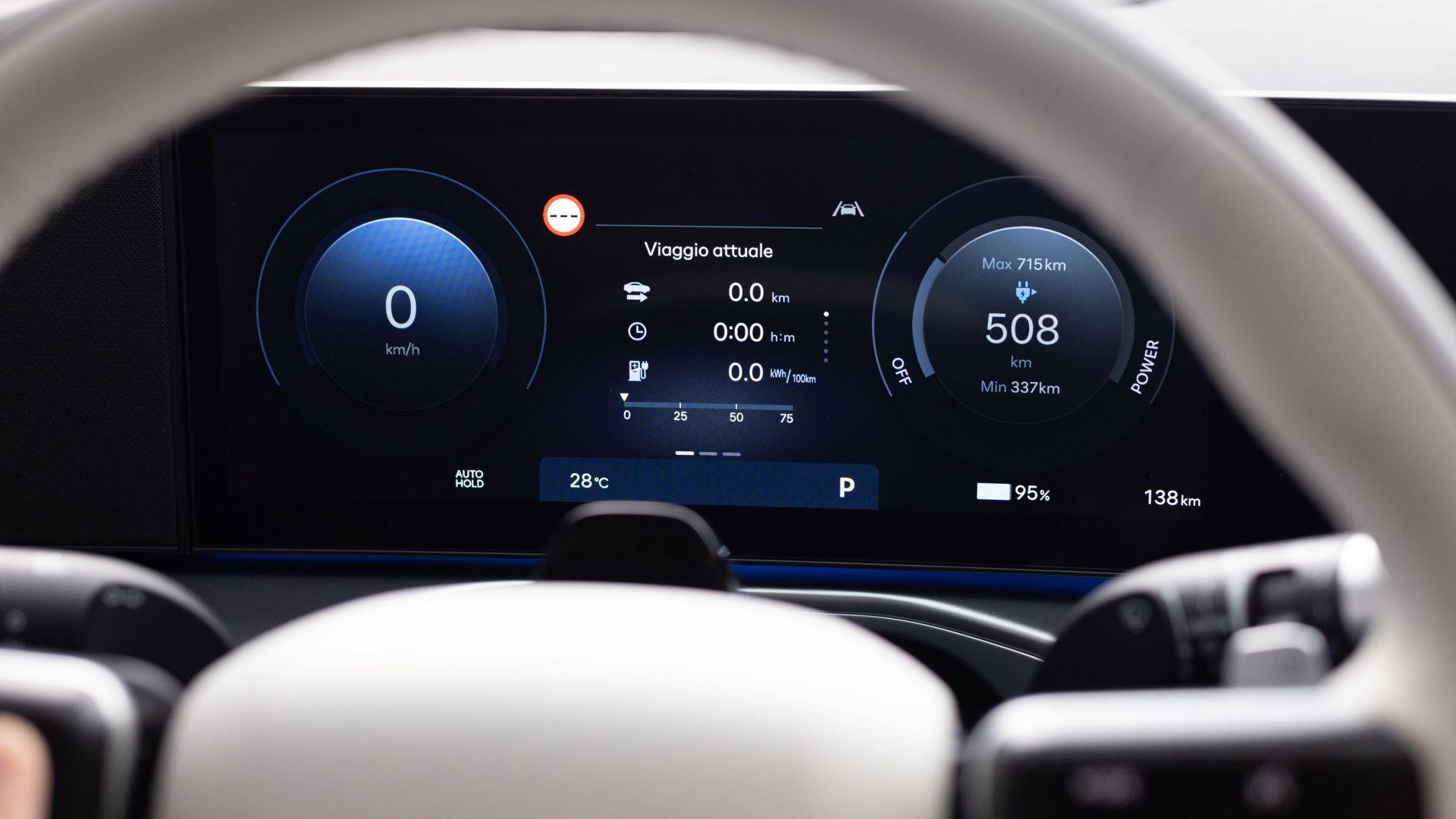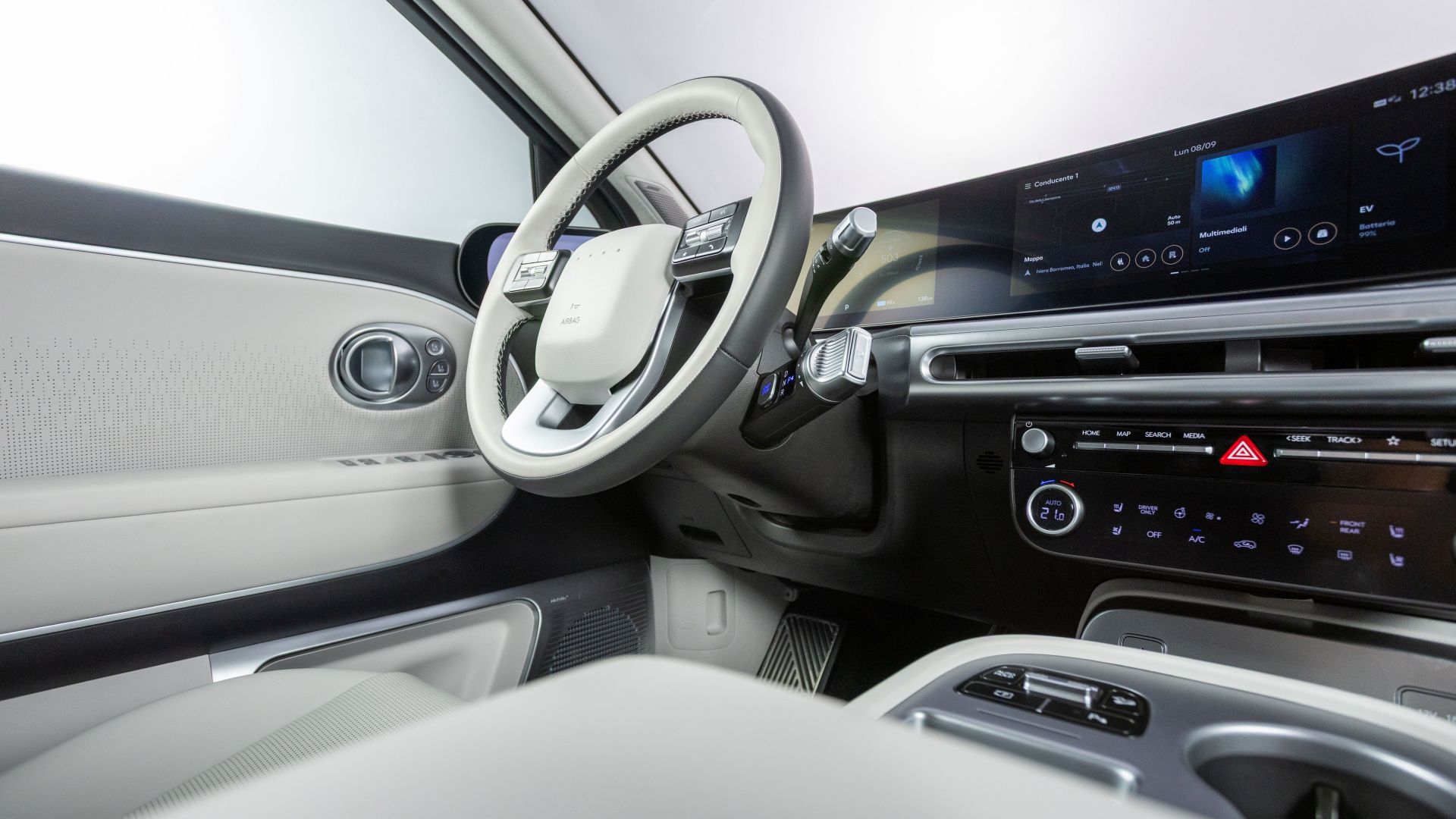 Dentro, il colpo d’occhio è hi-tech: doppio display da 12,3”, uno per la strumentazione SuperVision e l’altro per l’infotainment, compatibile con Apple CarPlay e Android Auto wireless. Non mancano aggiornamenti OTA, servizi connessi Bluelink, prese USB-C da 100 W e la funzione Vehicle-to-Load (V2L) per alimentare dispositivi esterni.