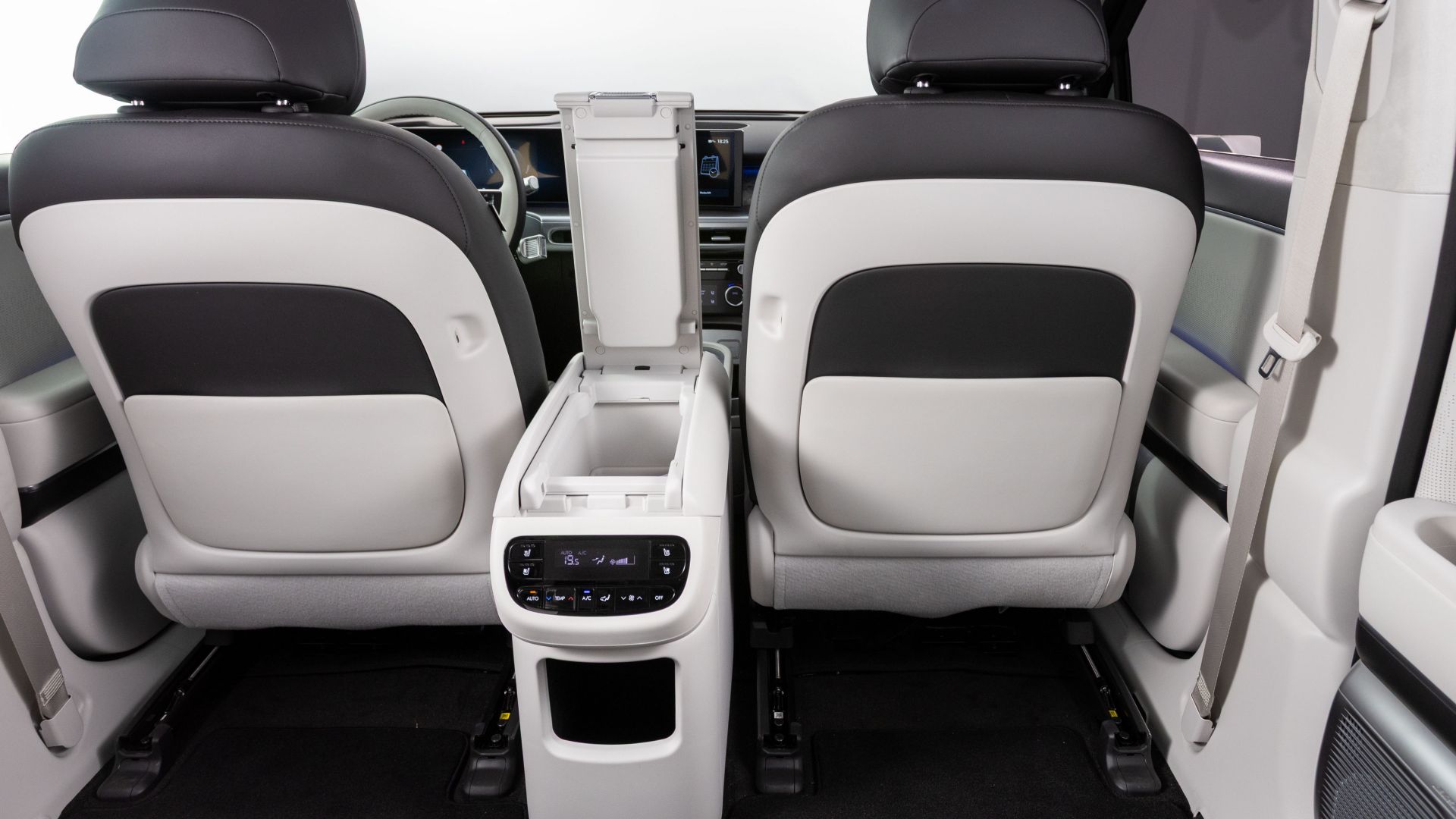 Ancora, i sedili anteriori hanno la funzione Relax, e grazie a un sostegno per le gambe si trasformano in chaise longue per favorire il pisolino durante le ricariche. La stessa funzione la troviamo nelle poltroncine della seconda fila, quando si sia scelta la Ioniq 9 in configurazione a 6 posti.