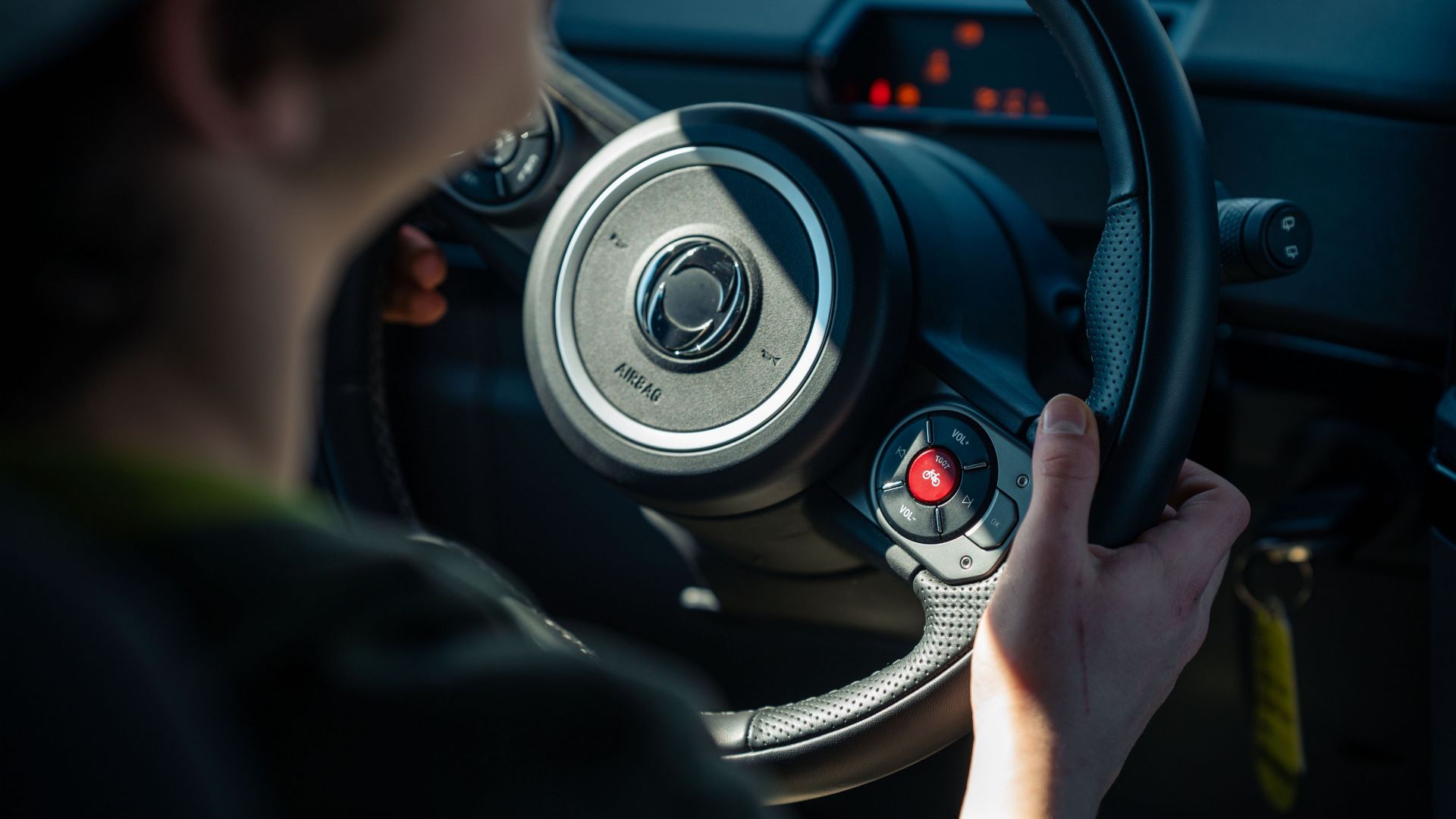Una di queste attenzioni, piccola ma rivelatrice, riguarda il clacson. Premendo al centro del volante si ottiene un avvisatore acustico potente e deciso. Ma sulla razza destra c'è un secondo pulsante, rosso, con il disegnino bianco di una bici: premendolo si aziona un clacson alternativo, dal tono gentile e vagamente rétro, pensato per evitare l’infarto ai ciclisti mentre si percorre una strada nei boschi. Non è una trovata di marketing. È il segno che qualcuno, in fase di progetto, non ha pensato soltanto alla distanza minima da terra (26 centimetri) e agli angoli di attacco, di uscita e di dosso.