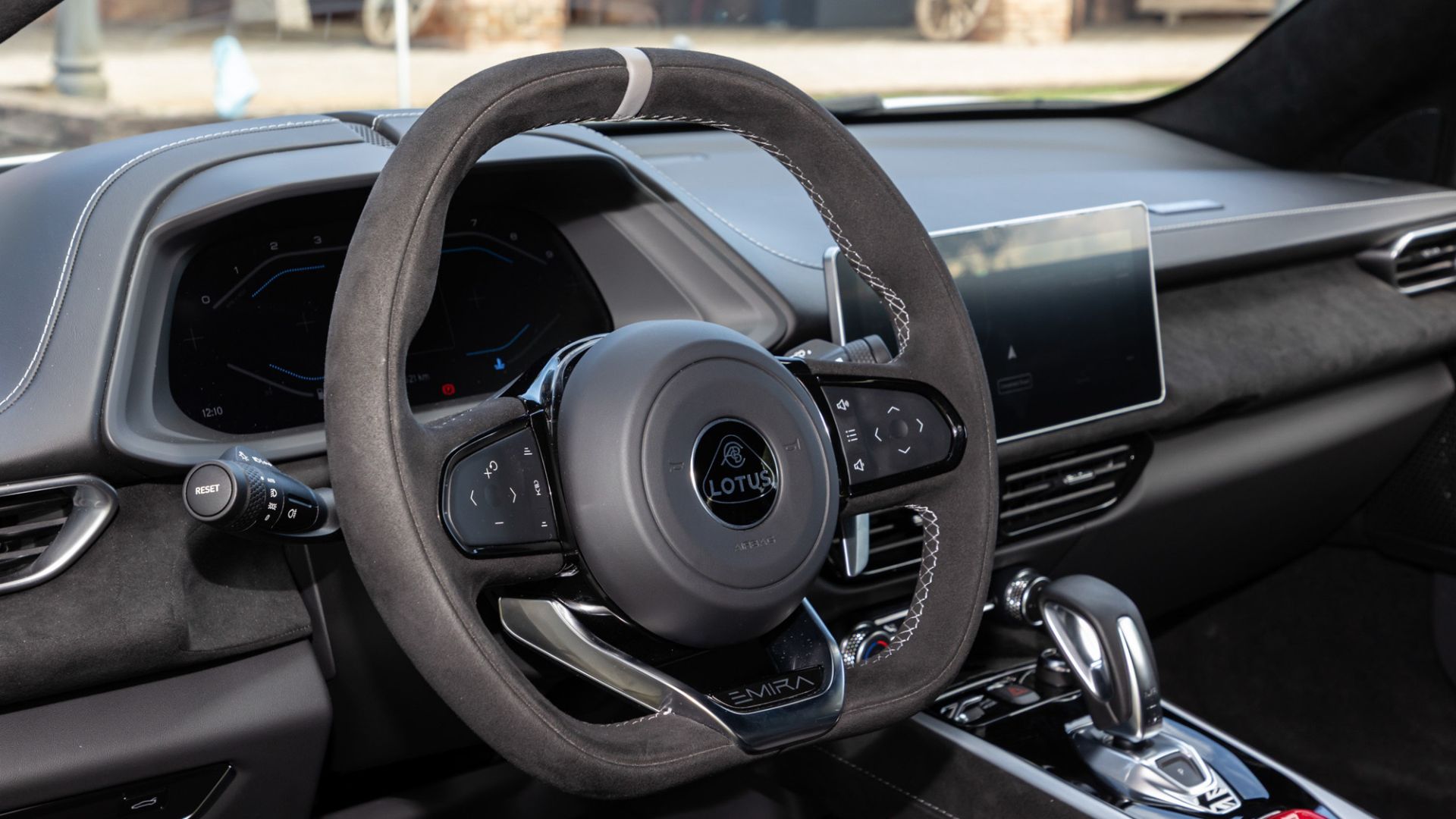 La Emira non ha un volante troppo diretto: sono ben più di due giri da un estremo all'altro, però non ha quasi alcun vuoto al centro e questo lo rende particolarmente pronto.