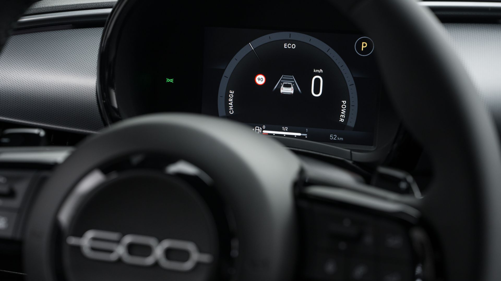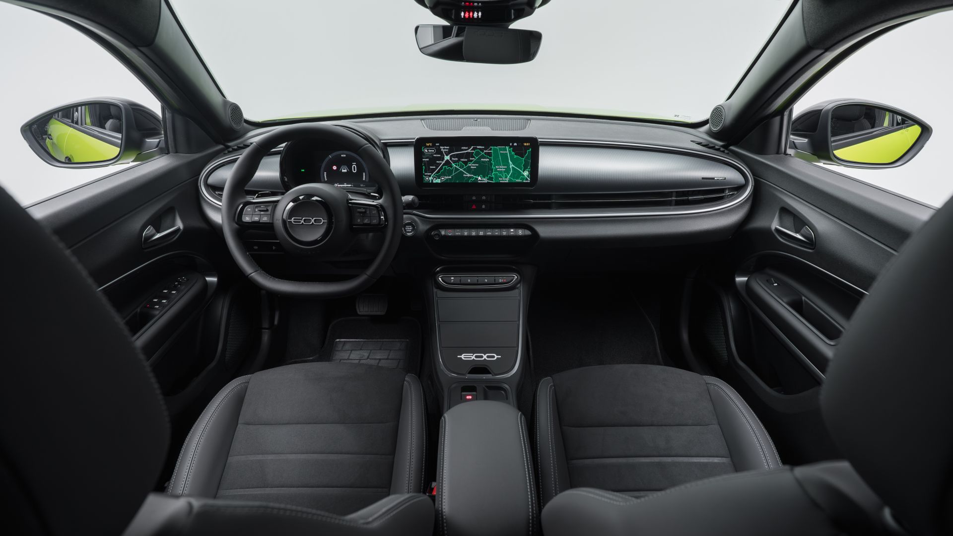 Anche all’interno lo stile di Fiat 600 non finisce di piacermi: semplice e personale come all’esterno. Bella la plancia pulita, con lo schermo centrale da 10 pollici basso e largo, funzionale senza proporre giga schermi televisivi.