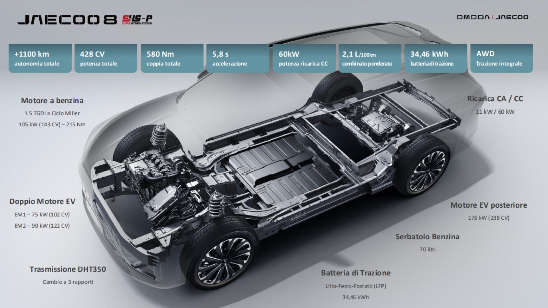 Jaecoo 8 esiste al lancio in un solo formato, cioè Super Hybrid System - Plug-in o, se devi risparmiare cararatteri, SHS-P.