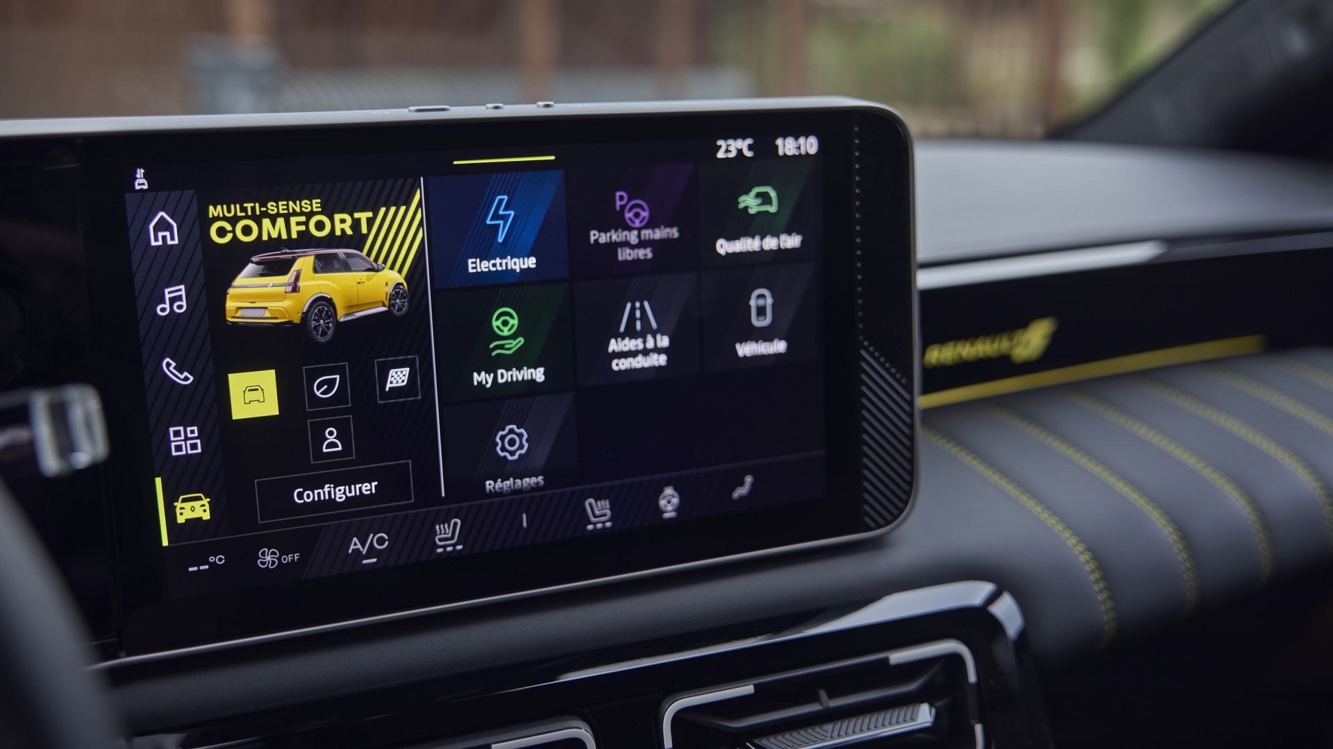 Renault 5 è compatta, ha i muscoli scolpiti da fartela sembrare perfino sportiva, furba e sbarazzina, specialmente nei colori giallo (quello della mia prova) e verde, ma anche ingegnosa: il numero 5 sul cofano che fa da indicatore di carica batteria lo trovo davvero una “genialata”. Cattura l’attenzione parcheggiata, ma anche in movimento, ti passa accanto silenziosa che quasi non te ne accorgi ma poi ti giri a cercarla, come quando ti passa accanto una bella donna con profumo inebriante.