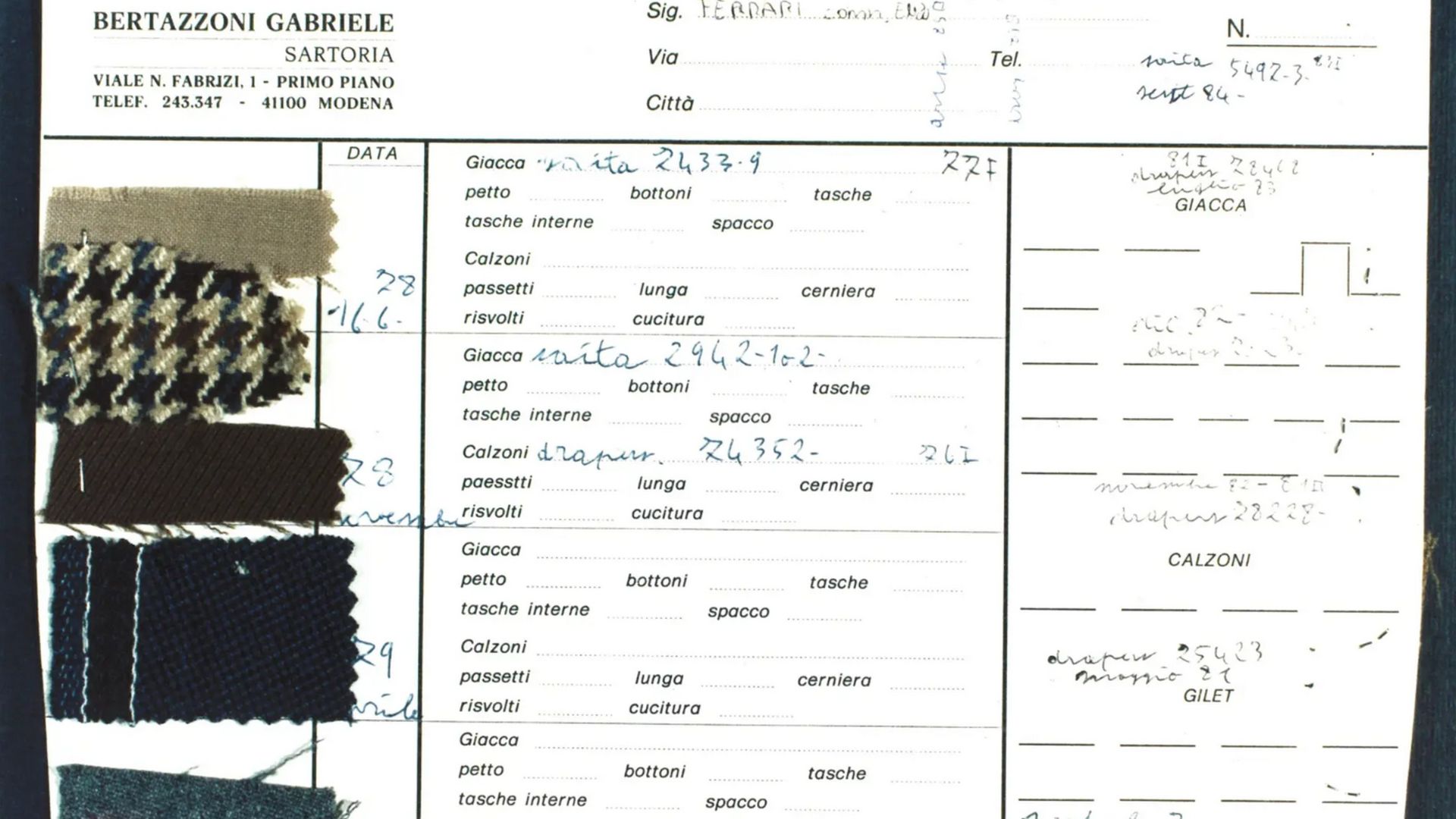 Ma il pezzo più personale è senza dubbio questo abito del 1979, cucito da Gabriele Bertazzoni, il sarto che negli anni ha definito l’estetica del Drake: severa, impeccabile, con quel tocco di eleganza emiliana che non si insegna, si eredita.
