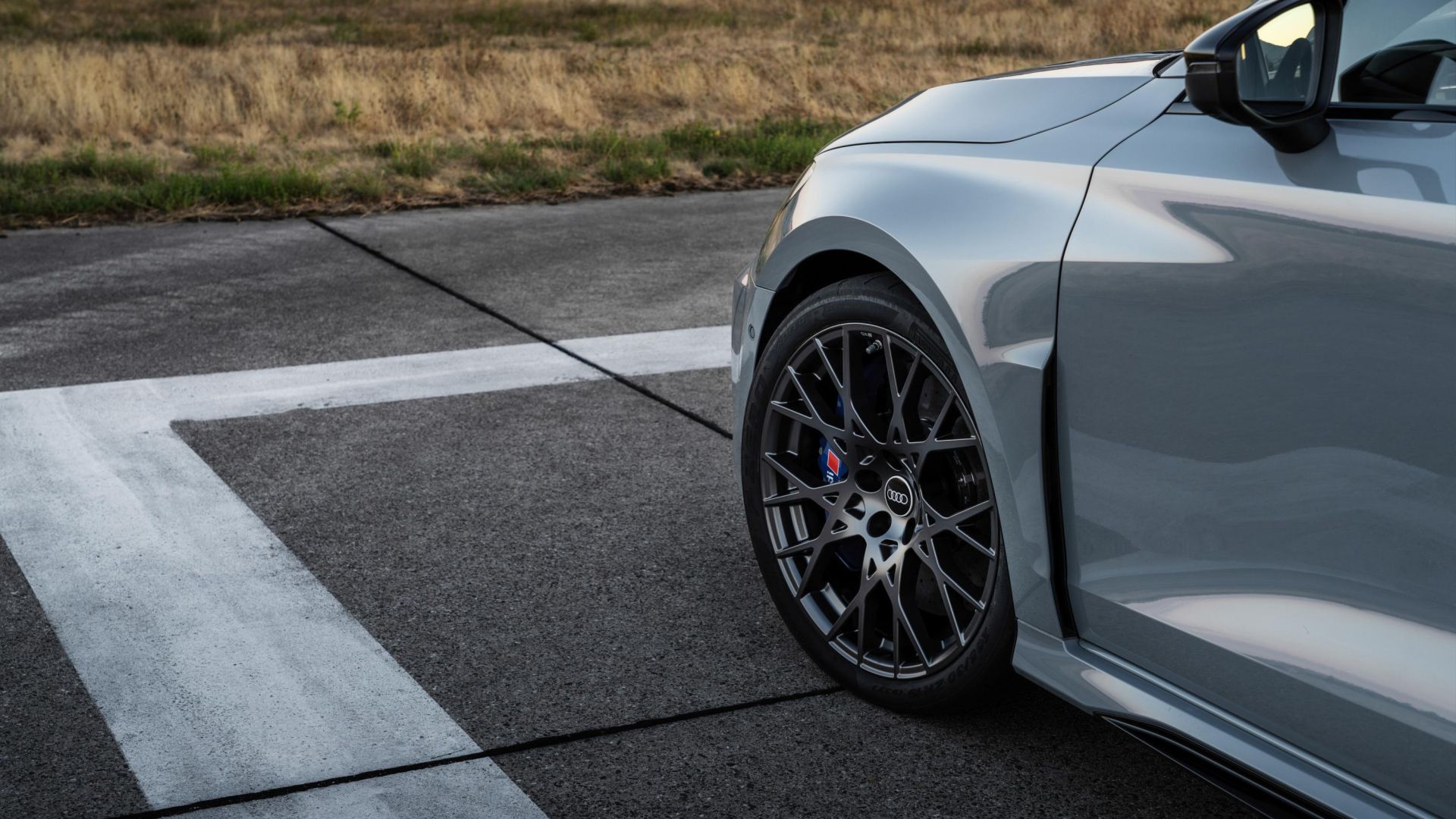 FINITURE SPORTIVE Da vera sportiva di razza la dotazione di serie, a partire dai cerchi in lega a 10 razze con finitura grigio scuro opaco e i terminali di scarico nero lucido. L’impianto frenante prevede dischi carboceramici anteriori da 380 mm di diametro, più leggeri di 10 kg rispetto ai freni della RS 3 standard, con pinze a sei pistoncini verniciate in colore blu. Le luci a LED dei gruppi ottici posteriori hanno animazioni specifiche per questo modello, mentre sotto gli specchietti retrovisori compaiono, aprendo le portiere, una bandiera a scacchi dal lato passeggero e la sequenza 3-0-0 dal lato guida.