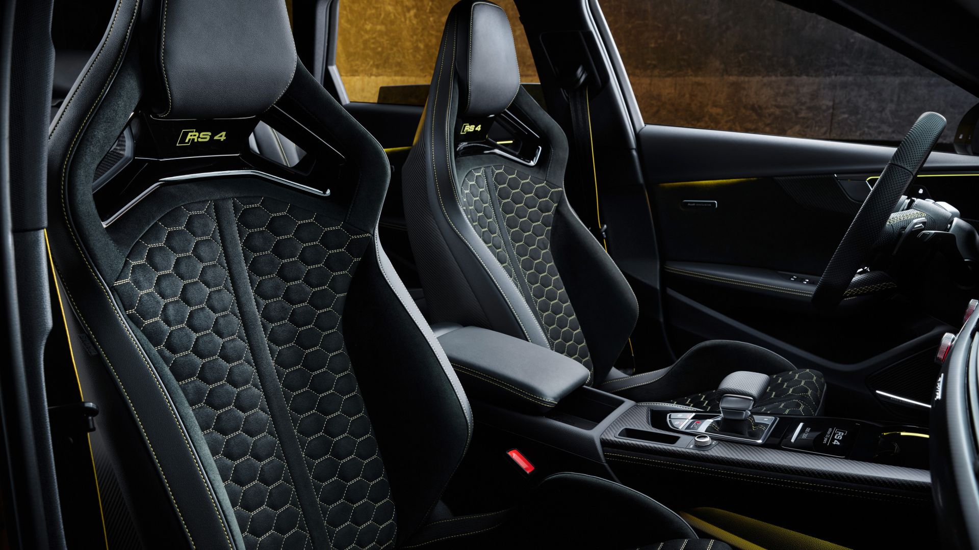 VISTA DA DENTRO Con le cuciture decorative gialle, anche gli interni ricordano la combinazione pelle Alcantara nera/gialla della RS4 Sport del 2001. Per la prima volta i tappetini hanno il logo RS 4, mentre il rombo Audi Sport (tradizionalemente rosso) e la scritta RS nera sono ora anche in giallo. La corona del volante, i braccioli in pelle sulle porte, la consolle centrale in Alcantara nero scuro e la cuffia del cambio presentano cuciture dello stesso colore. I sedili avvolgenti RS con cuciture a nido d'ape e lo schienale in carbonio sono infine dotati di una squisita combinazione pelle nera profonda/Dinamica con cuciture gialle a contrasto. Direttamente sotto il poggiatesta, la scritta RS 4 dello stesso colore. La scritta opaca sulla console centrale indica il numero sequenziale di ogni singola vettura, da 1 a 250. Tramite l'MMI, si può anche selezionare uno sfondo bianco per contagiri e tachimetro, un omaggio all'Audi Avant RS2 del 1994.