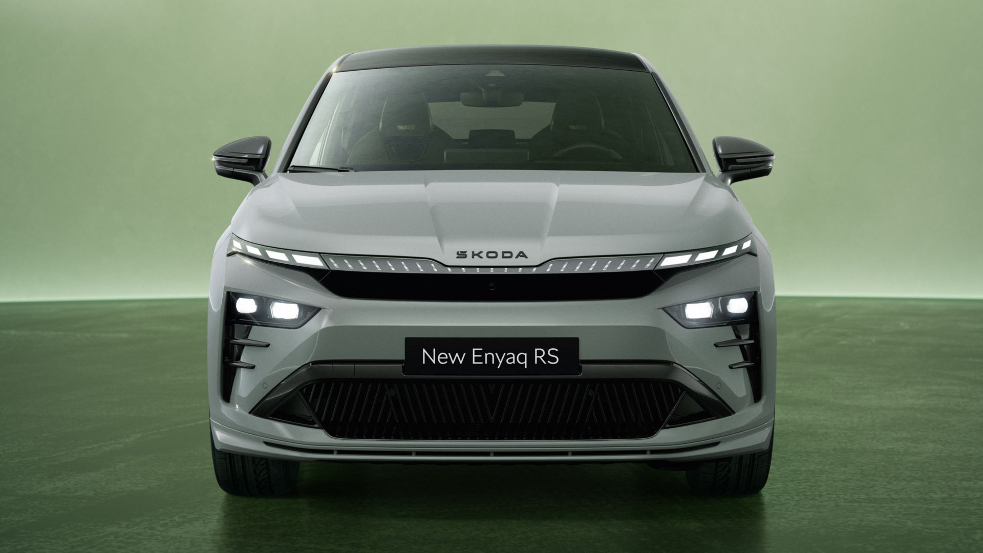 Le nuove Enyaq RS adottano il linguaggio di design Modern Solid di Škoda, con elementi distintivi come la griglia illuminata Tech-Deck Face in nero lucido e i fari LED Matrix di serie.