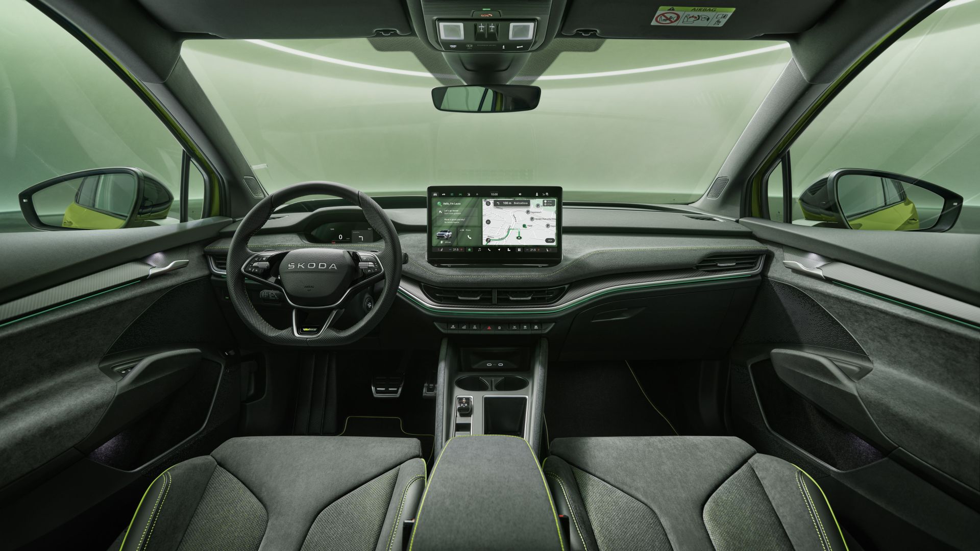All'interno, le più sportive tra le Enyaq offrono due Design Selection: RS Suite e RS Lounge. La prima combina pelle vera e pelle sintetica con cuciture grigie, mentre la seconda utilizza microfibra e pelle sintetica con cuciture a contrasto verde lime.