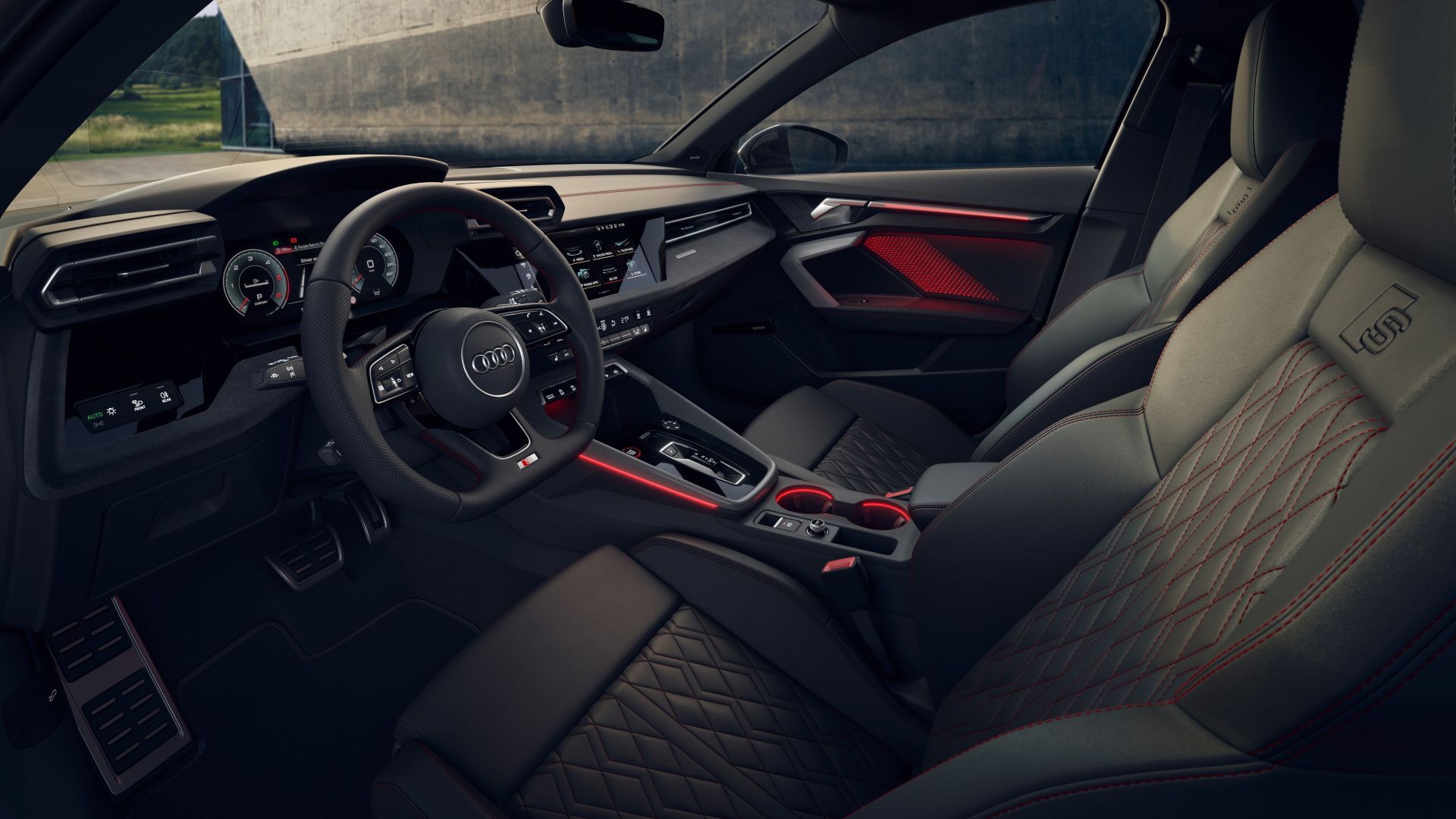 INTERNI In abitacolo, analogamente alla rinnovata gamma Audi A3, spiccano il nuovo selettore del cambio, simile esteticamente a quanto in dotazione al SUV full electric Audi Q4 e-tron, le bocchette di ventilazione ridisegnate, gli inserti decorativi in tessuto e l’illuminazione interna rivista. Dominano le tinte scure: cielo in tessuto nero, pedaliera in acciaio inox e battitacco anteriori con inserti in alluminio e logo S illuminato. Il volante multifunzione a 3 razze rivestito in pelle è corredato delle levette del cambio e caratterizzato dalla parte inferiore della corona “tagliata”. I sedili anteriori sportivi con poggiatesta integrati, dal contenimento laterale superiore rispetto al precedente modello, sono infine parzialmente rivestiti con materiali ottenuti dal riciclo delle bottiglie in PET (microfibra Dinamica) e caratterizzati dalle cuciture a contrasto e dal logo S agli schienali. A richiesta sono disponibili i rivestimenti delle sedute in raffinata pelle Nappa nera con impunture rosse.