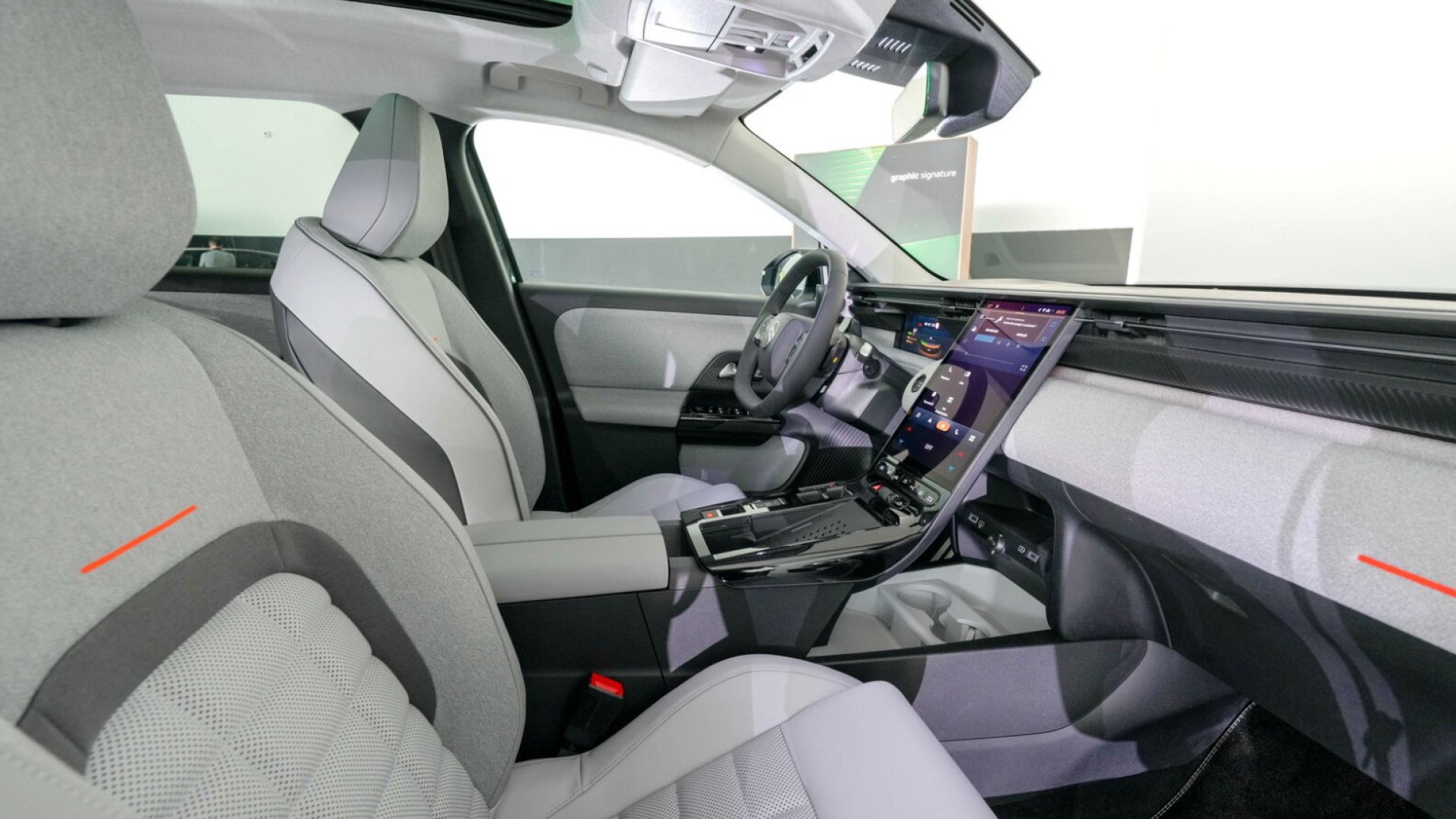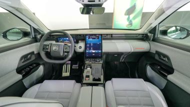 Ambiente che innanzitutto esprime una plancia ariosa, lunga e orizzontale, progettata come un mobile da salotto. La parte inferiore è rivestita di un tessuto schiumato di alta qualità, di colore chiaro o scuro, che si estende ai pannelli delle porte e ai sedili, creando un'atmosfera omogenea, piacevole.