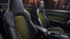 Anche l’abitacolo della 911 Spirit 70 richiama i dettagli delle Porsche degli anni Settanta. I sedili presentano fasce centrali in tessuto Neo Pasha nero e oliva, con motivo a scacchiera, e sono realizzati con una combinazione di tessuto e filato floccato. Questo originale disegno è ispirato alle bandiere a scacchi che sventolano all'arrivo delle corse automobilistiche.