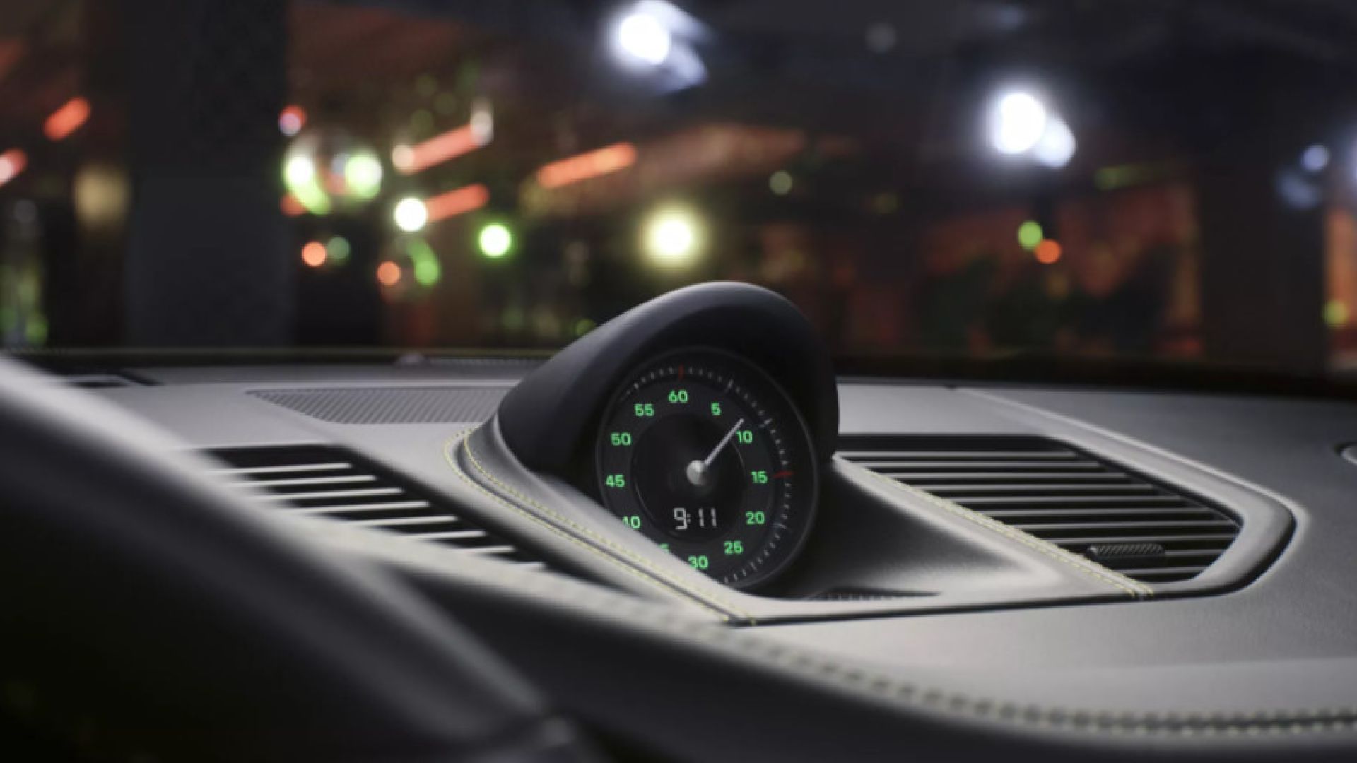 Il quadro strumenti digitale da 12,65 pollici utilizza lancette bianche e cifre verdi, con layout analogico. Anche il cronometro Sport Chrono segue lo stesso stile, ed è disponibile un cronografo Porsche Design abbinabile alla vettura. In dotazione di serie anche un tappetino reversibile per il bagagliaio con disegno Pasha.