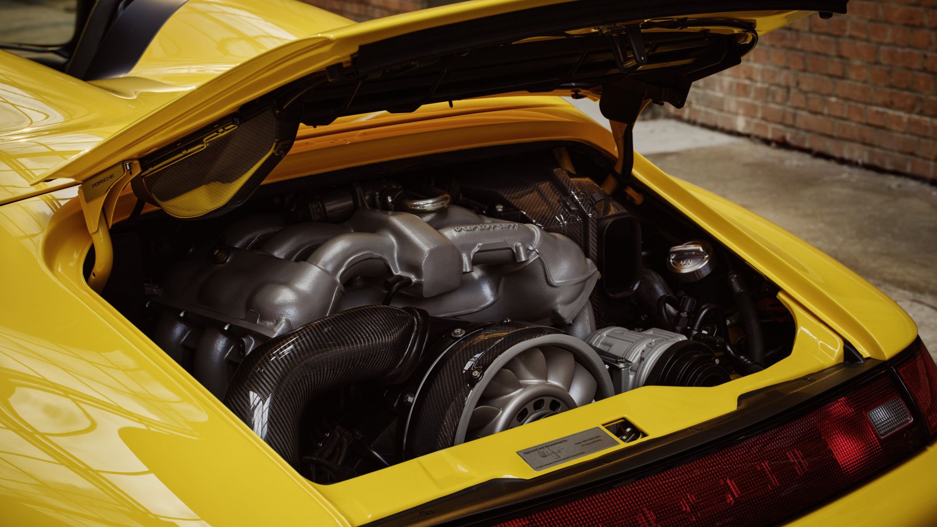SOTTO LA CARROZZERIA Al'interno è presente il Porsche Classic Communication Management (PCCM): modernissimo infotainment dal design rétro, completo di navigatore e Apple CarPlay. I sedili hanno il guscio in carbonio, materiale che ritroviamo nelle finiture del cruscotto, della console centrale, della leva cambio e del freno a mano, ma il vero colpo d'ala è la selleria in pelle con le sedute ricamate a quadretti gialli e neri: ciascuno cucito a mano. Lo stesso motivo si ritrova nel bagagliaio anteriore rivestito in pelle, nella copertura dell'auto e nella borsa da turismo abbinata. L'attenzione ai dettagli è sottolineata dai simboli disegnati sui tasti che comandano i vetri elettrici: ridisegnati per riprendere il tipico profilo laterale della Speedster. Il motore, il telaio, lo sterzo e l'impianto frenante provengono dalla 911 Carrera RS (Tipo 993), il cui boxer a sei cilindri raffreddato ad aria da 3,8 litri e 300 CV era all'epoca il motore più potente della Cavallina di Stoccarda.