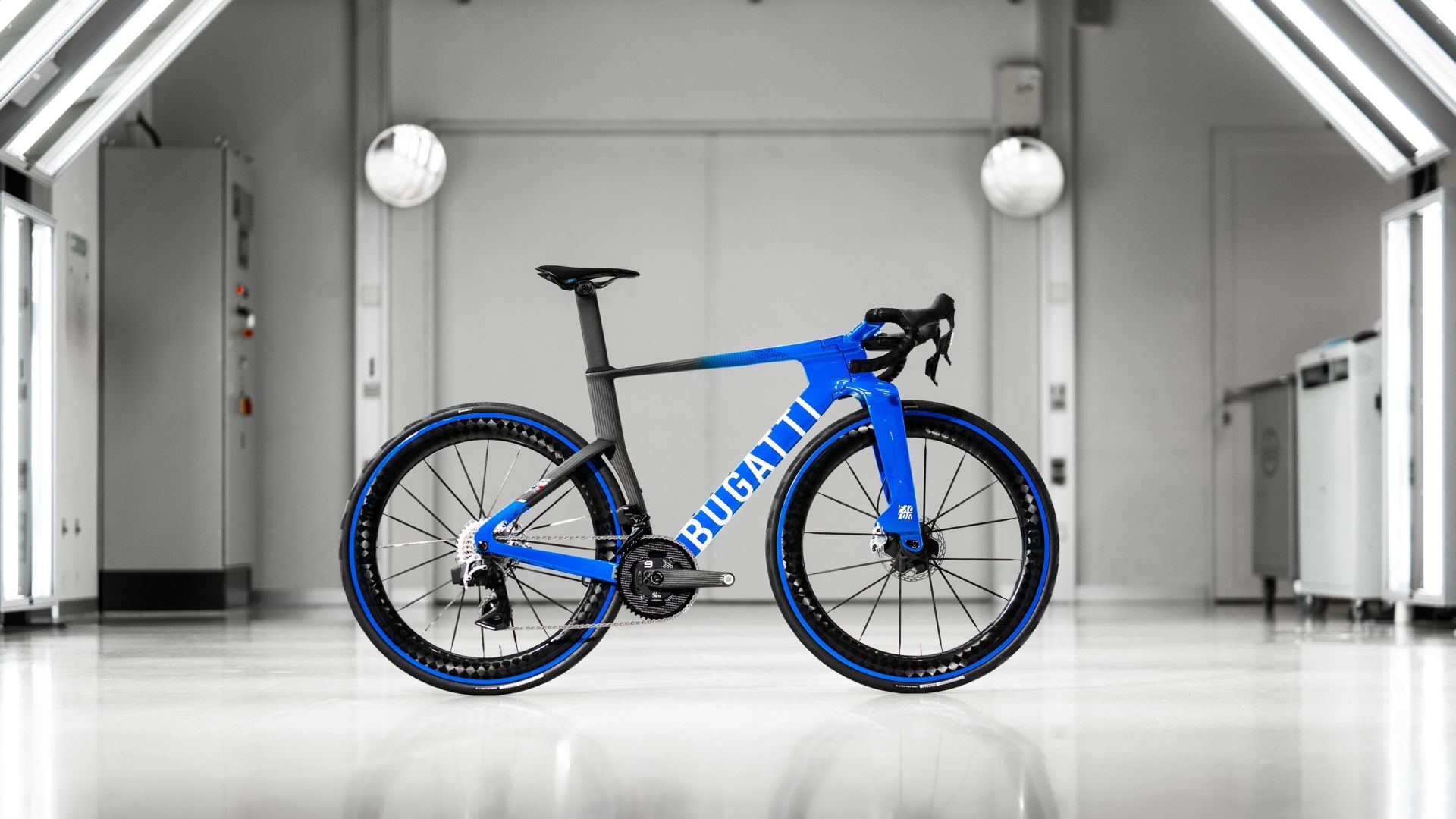 Il telaio sfoggia la classica Bugatti Blue, la stessa che accompagnava la Type 35 quando dominava i Gran Premi negli anni ’20. La grafica bicolore divide le superfici come sulle hypercar, mentre il logo BUGATTI in bianco corre lungo il tubo obliquo per ricordare a chiunque - anche a 60 all’ora in scia - che no, non è “una bici come le altre”.