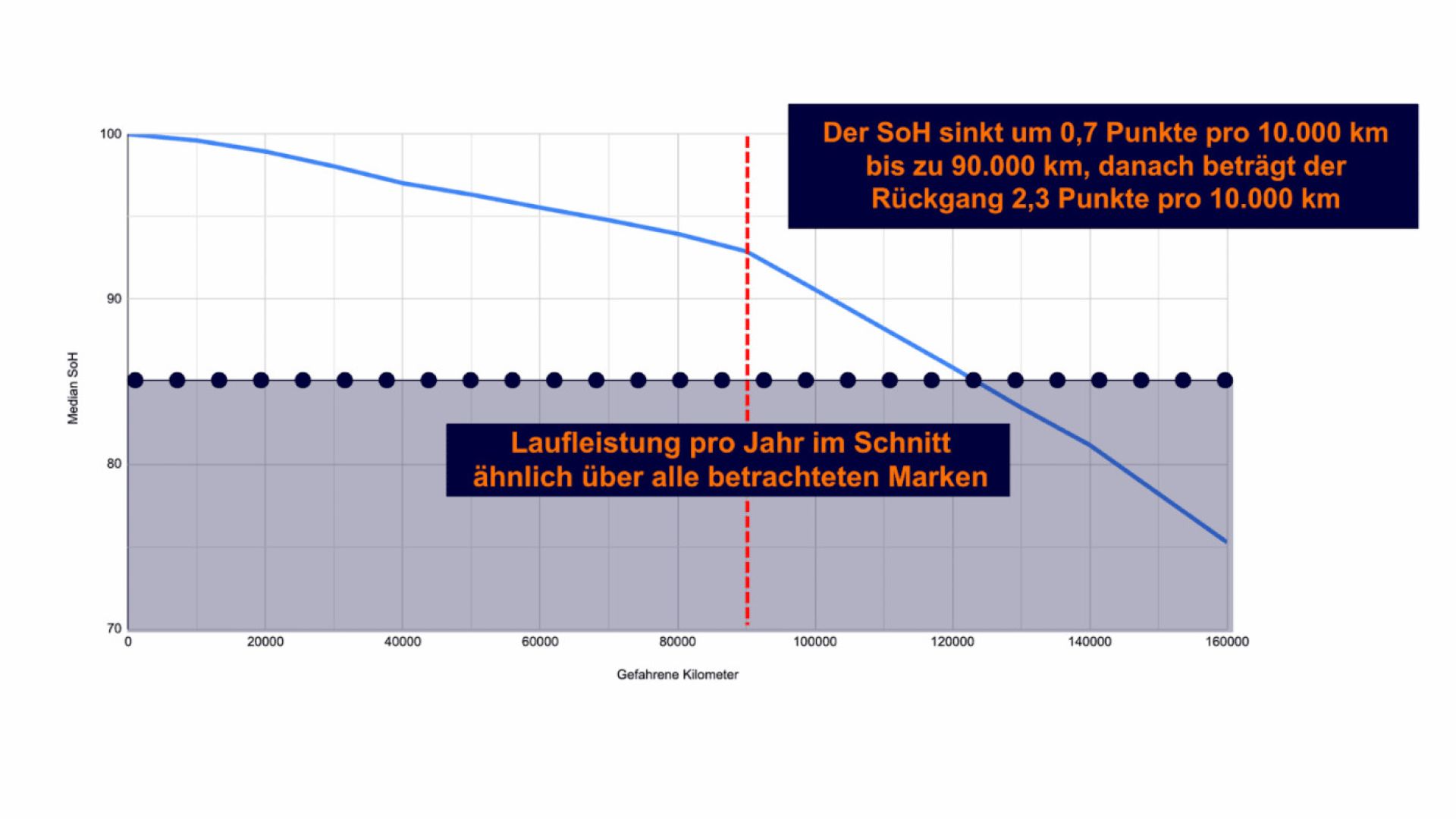 L'analisi condotta mette in evidenza che il punteggio SoH diminuisce in modo relativamente moderato, di circa 0,7 punti ogni 10.000 km durante i primi 90.000 km percorsi. Successivamente, il degrado della batteria accelera in relazione al chilometraggio. A partire da circa 90.000 km, la diminuzione media è di circa 2,3 punti ogni 10.000 km. Ovviamente, l'analisi mostra che le condizioni della batteria sono generalmente migliori nei veicoli più recenti. Tuttavia, i risultati diventano particolarmente interessanti se si considerano l'età e il chilometraggio dei veicoli. Facciamo alcuni esempi.