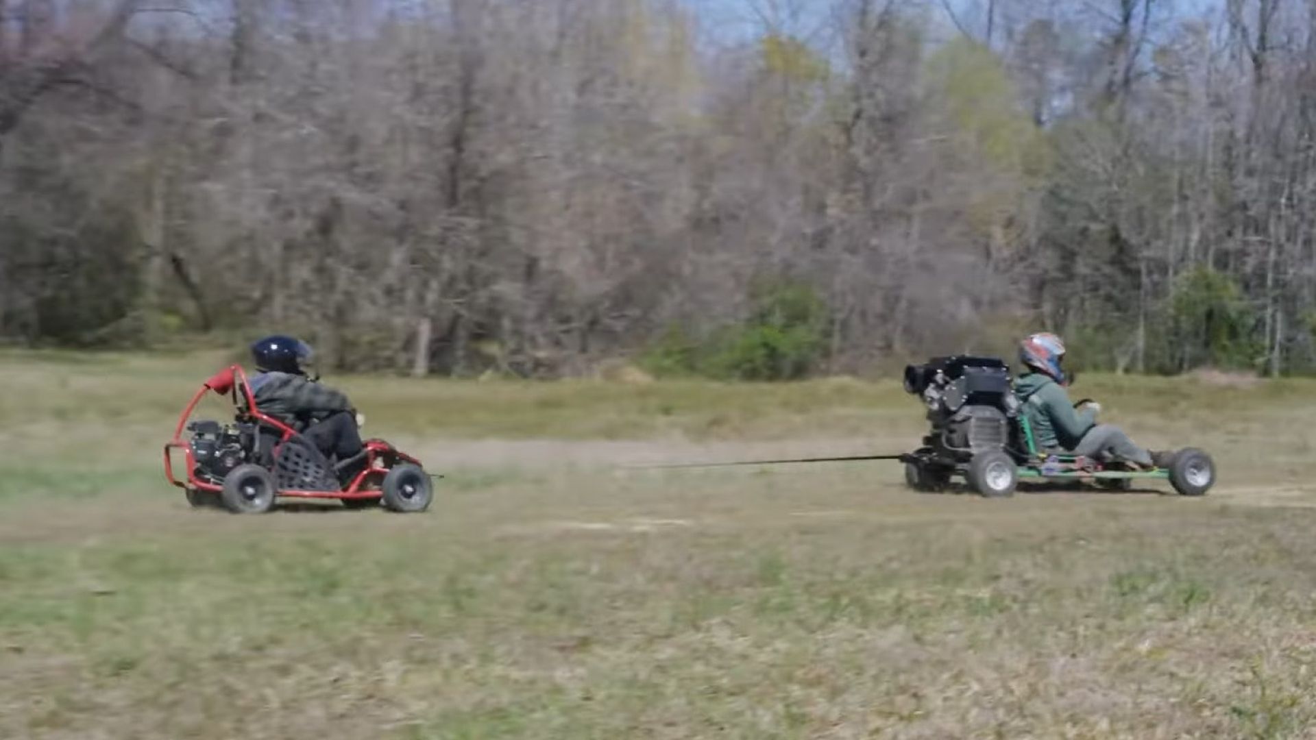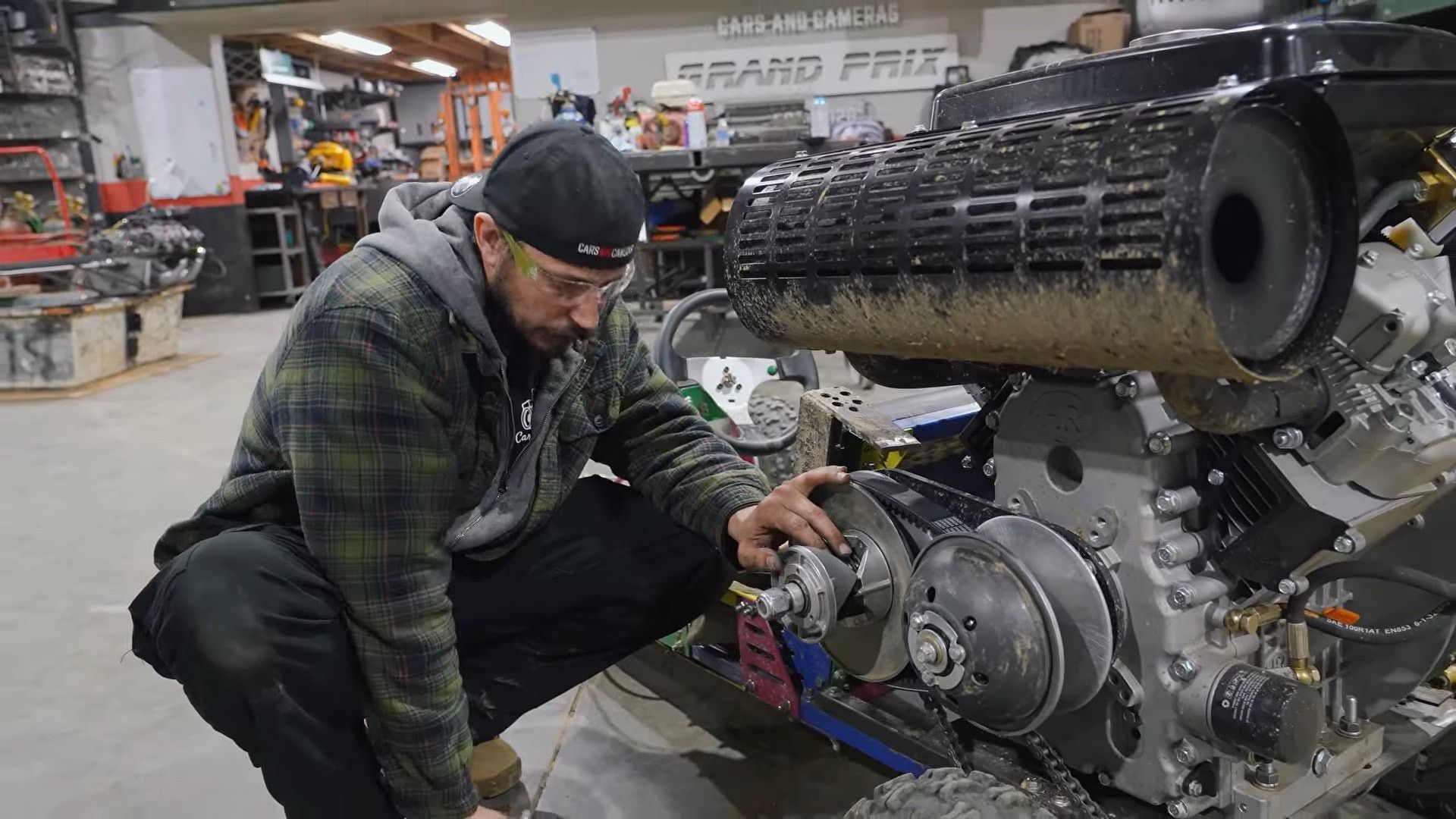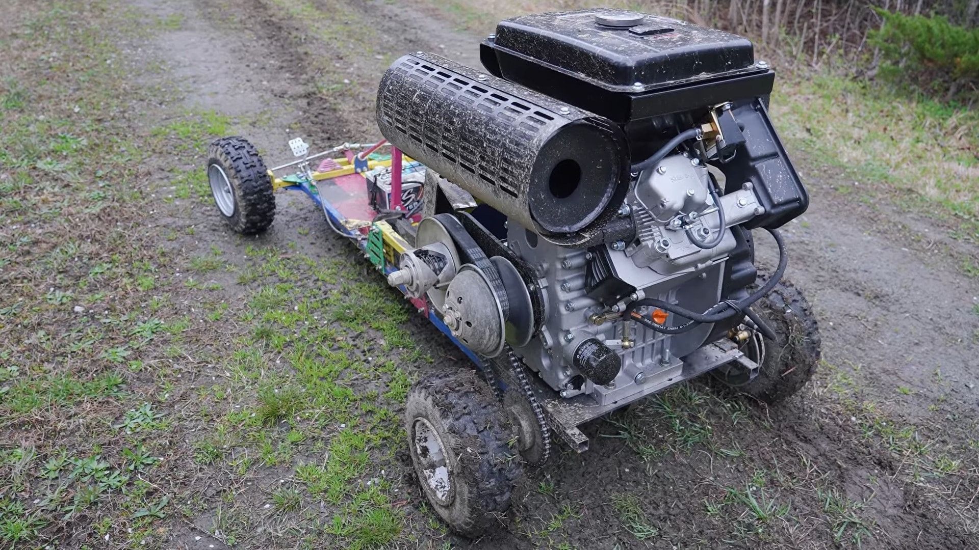 Il kart originale, però, non era strutturato per ospitare qualcosa del genere: l'assale posteriore è stato perciò arretrato di quindici centimetri, il motore ora siede su un telaio ausiliario in acciaio rinforzato con angolari e, una volta montato in posizione, il blocco motore arriva all'altezza della testa del pilota seduto. Non è un go-kart con un grosso motore: è un motore con un piccolo go-kart attaccato sotto.