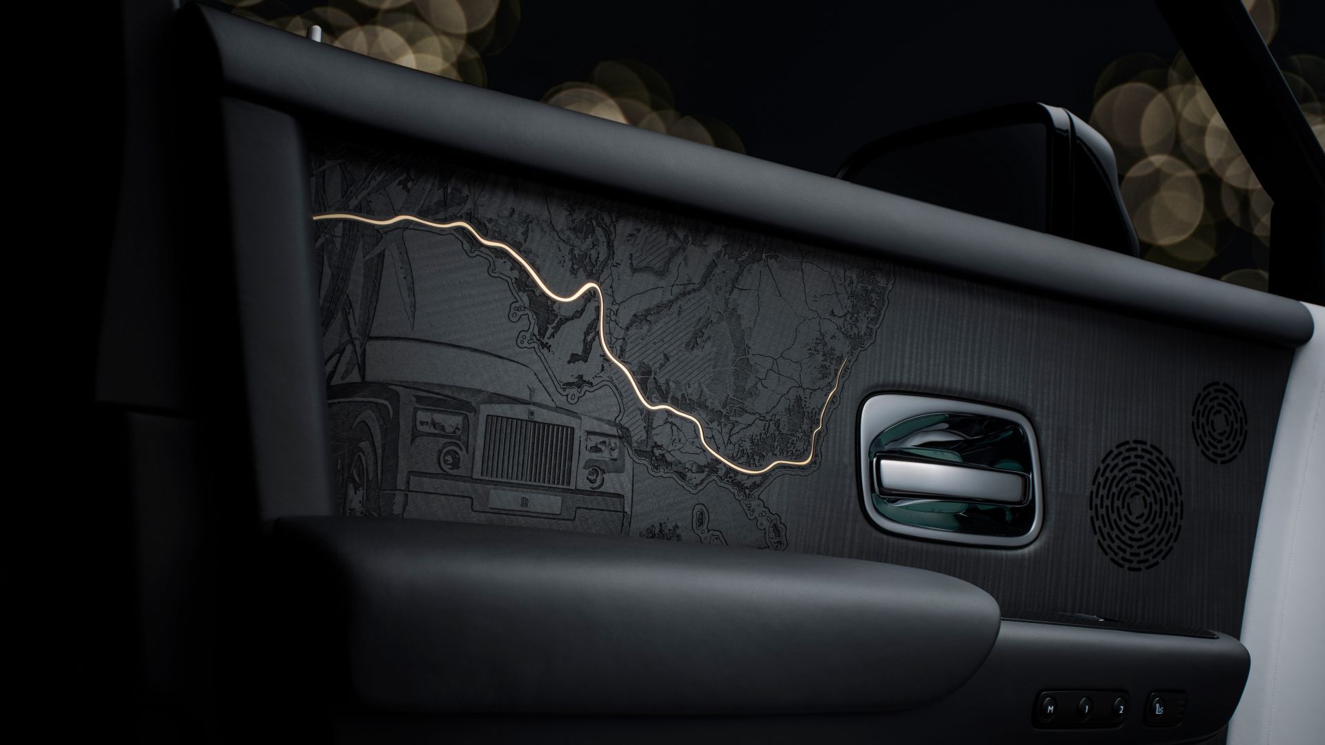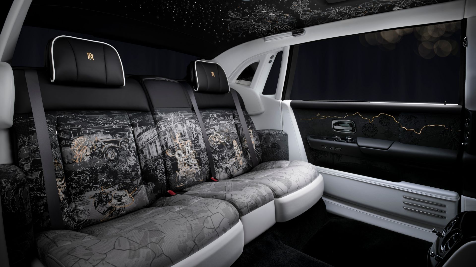 Apri le portiere e ti sembra di entrare in una graphic novel di lusso. I sedili posteriori raccontano la storia della Phantom attraverso tre livelli artistici: uno sfondo stampato in alta risoluzione che raffigura luoghi storici legati al marchio, come la sede di Conduit Street o i dipinti di Henry Royce; un secondo strato che mostra le Phantom più leggendarie, disegnate nei minimi dettagli; un terzo livello ricamato, che rappresenta sette celebri proprietari nel corso dei decenni.