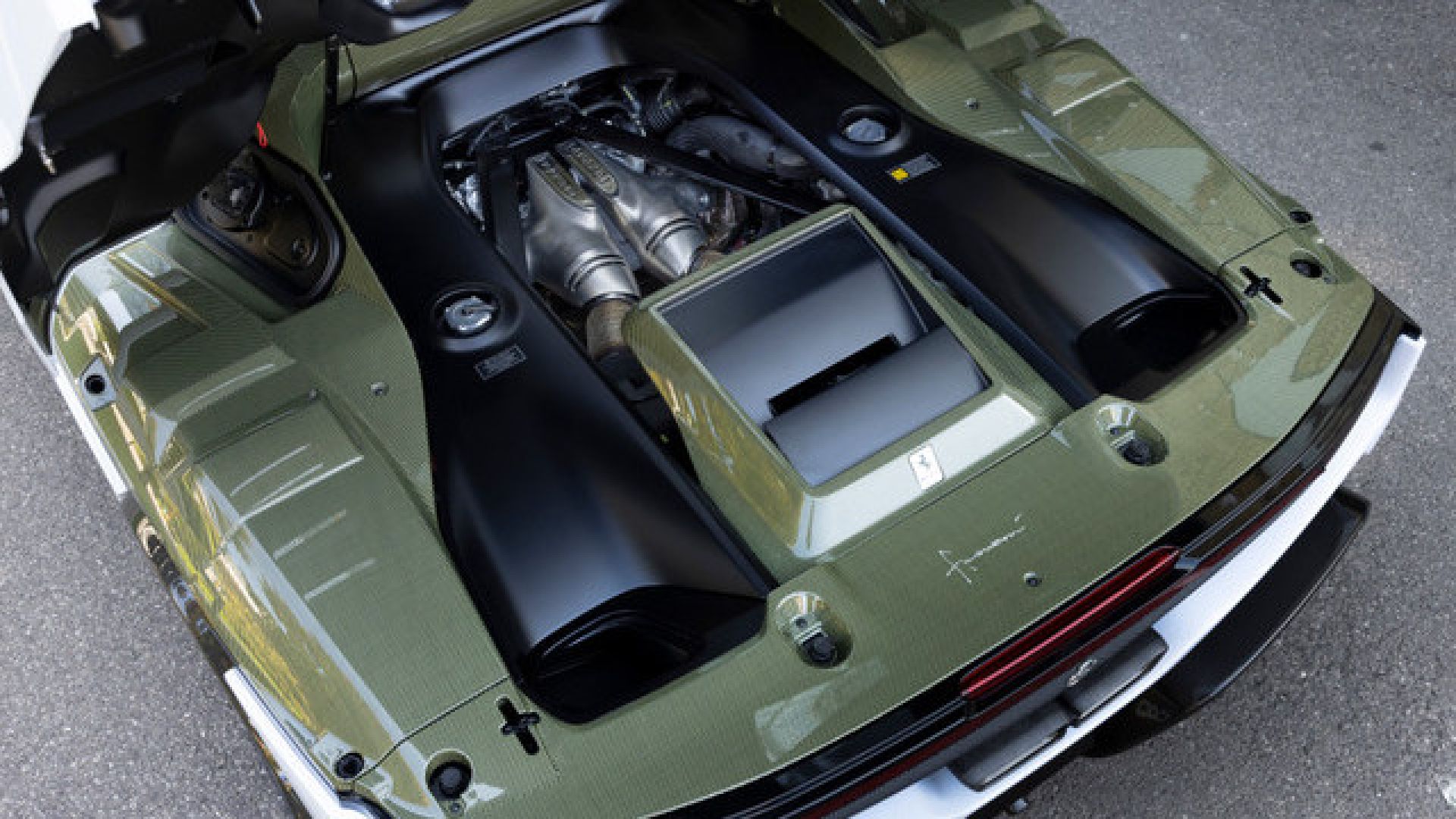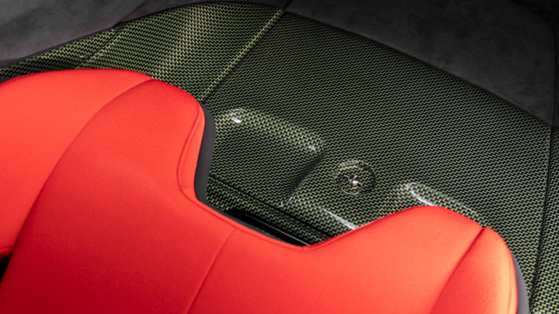 Le finiture sono realizzate in un materiale speciale definito carbon kevlar, una sorta di fibra di carbonio con sfumature verdi che evocano il kevlar delle vetture Ferrari degli anni ’80. Il materiale è presente anche sul pavimento e nella parte posteriore dell’abitacolo, conferendo un’atmosfera sportiva e autentica.
