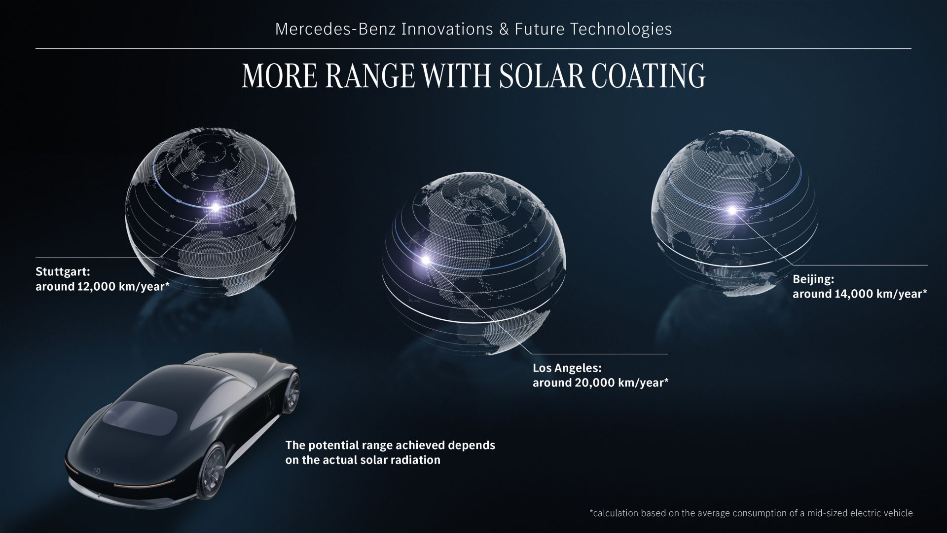 Mercedes stima che la vernice fotovoltaica possa valere circa 12.000 km l'anno gratis con l'irraggiamento solare tipico di Stoccarda; 20.000 km l'anno a Los Angeles e 14.000 km l'anno a Pechino. Non sulla Vision Iconic, però, visto che questo calcolo si basa sui consumi tipici di un veicolo elettrico di medie dimensioni, mentre la Vision Iconic sembra un vero gigante della strada.