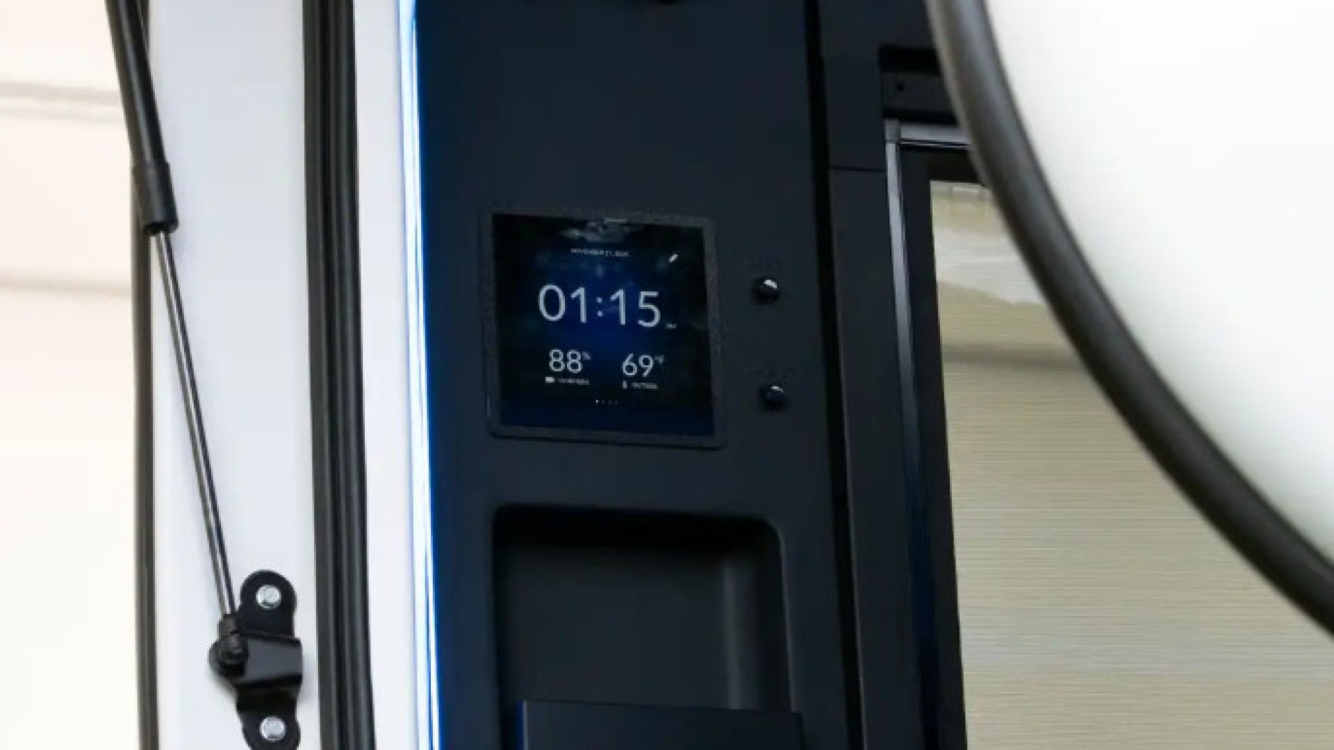 L’estetica richiama una scatola di forma aerodinamica su ruote, con superfici pulite, angoli arrotondati e ampie superfici vetrate. Sul fianco spicca una striscia di luci personalizzabile, pensata sia per l’illuminazione del campeggio sia per migliorare l’atmosfera esterna.