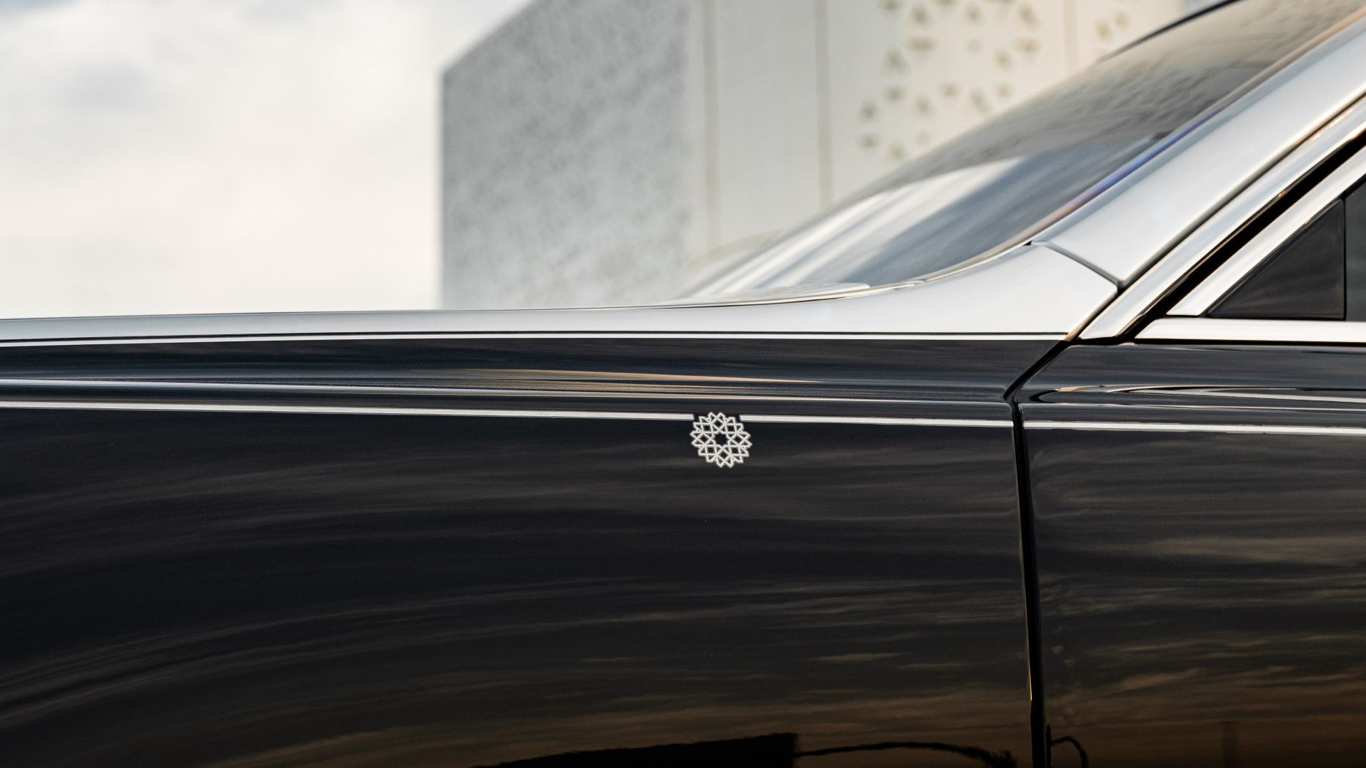 La carrozzeria è un two‑tone Diamond Black + Silver, la coachline è dipinta a mano con lo stesso motivo geometrico, la Pantheon Grille è illuminata, lo Spirit of Ecstasy pure e i cerchi da 22 pollici fanno da cornice a un autentico monumento viaggiante alla cultura araba.