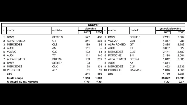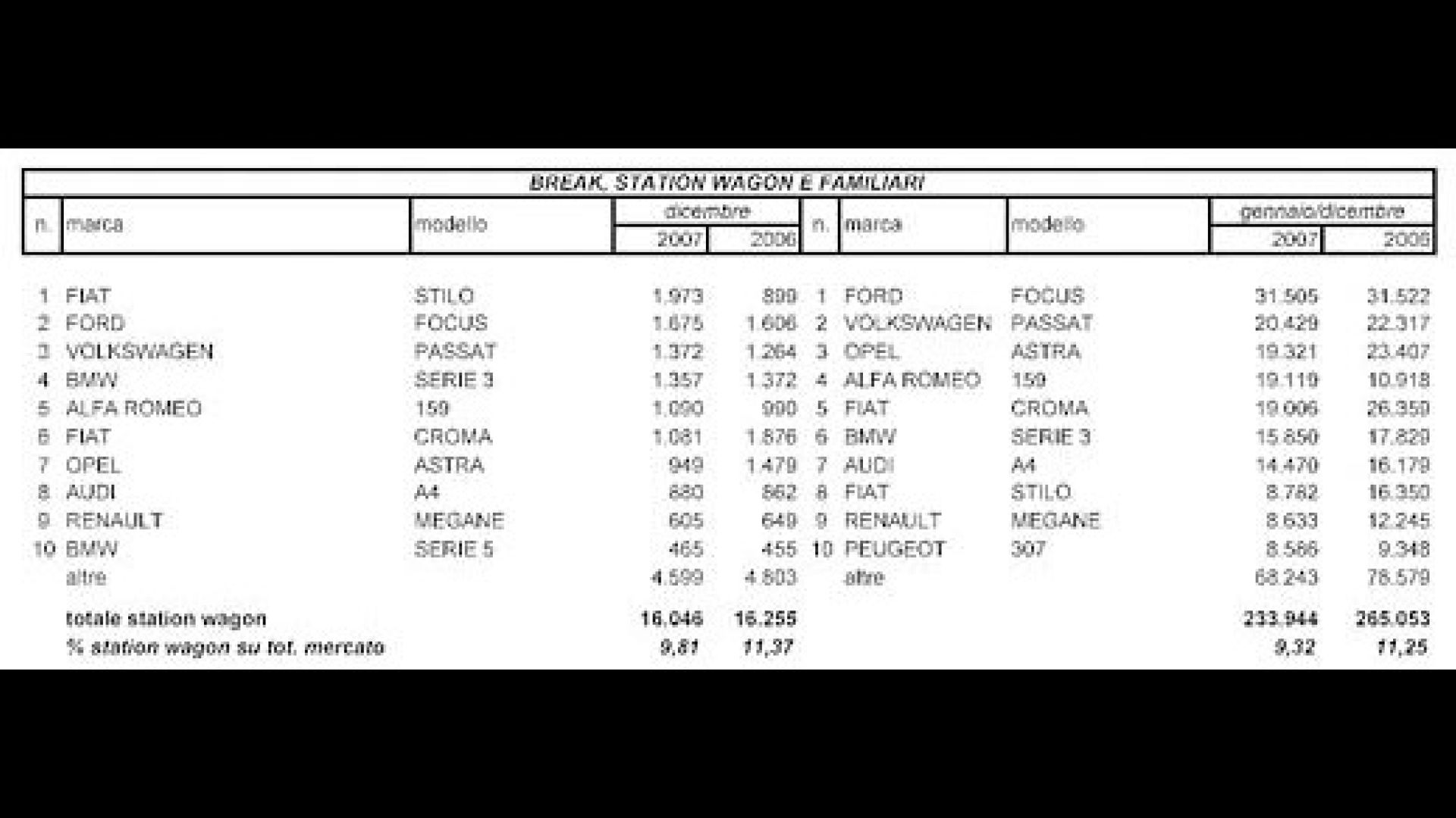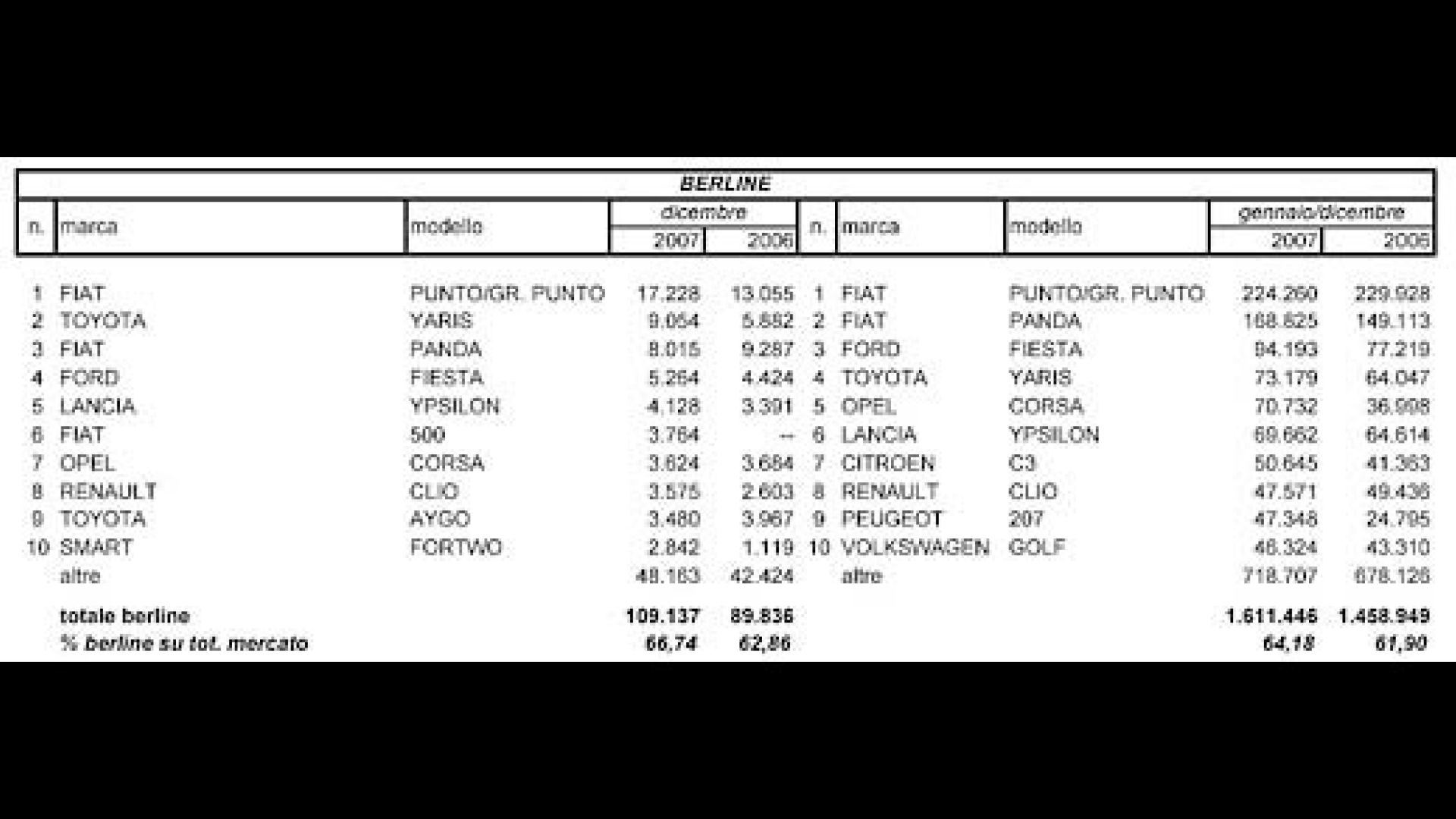 TOP TEN In assoluto l'auto più venduta è stata ancora una volta la Fiat Grande Punto (224.167 unità) seguita da Fiat Panda (168.810) e da Ford Fiesta (94.193). Ma interessanti sono anche le analisi per tipo di carrozzeria. Fra le Station Wagon domina la Ford Focus, mentre tra le Fuoristrada è la Fiat Sedici a dettare legge, così come laMercedes Classe A è la prima tra le Monovolume Compatte, la Lancia Musa tra le Monovolume Piccole e la Ford S-Max tra le Monovolume Grandi. La Cabrio più venduta è stata invece la Smart ForTwo, mentre tra le Coupé è la Bmw Serie 3 la preferita dagli italiani. Senza sorprese la prima posizione tra le Crossover della Nissan Qashqai e stessa sorte per laFiat Doblò nelle Multispazio. Qui di seguito la classifica assoluta e le Top ten del 2007.
