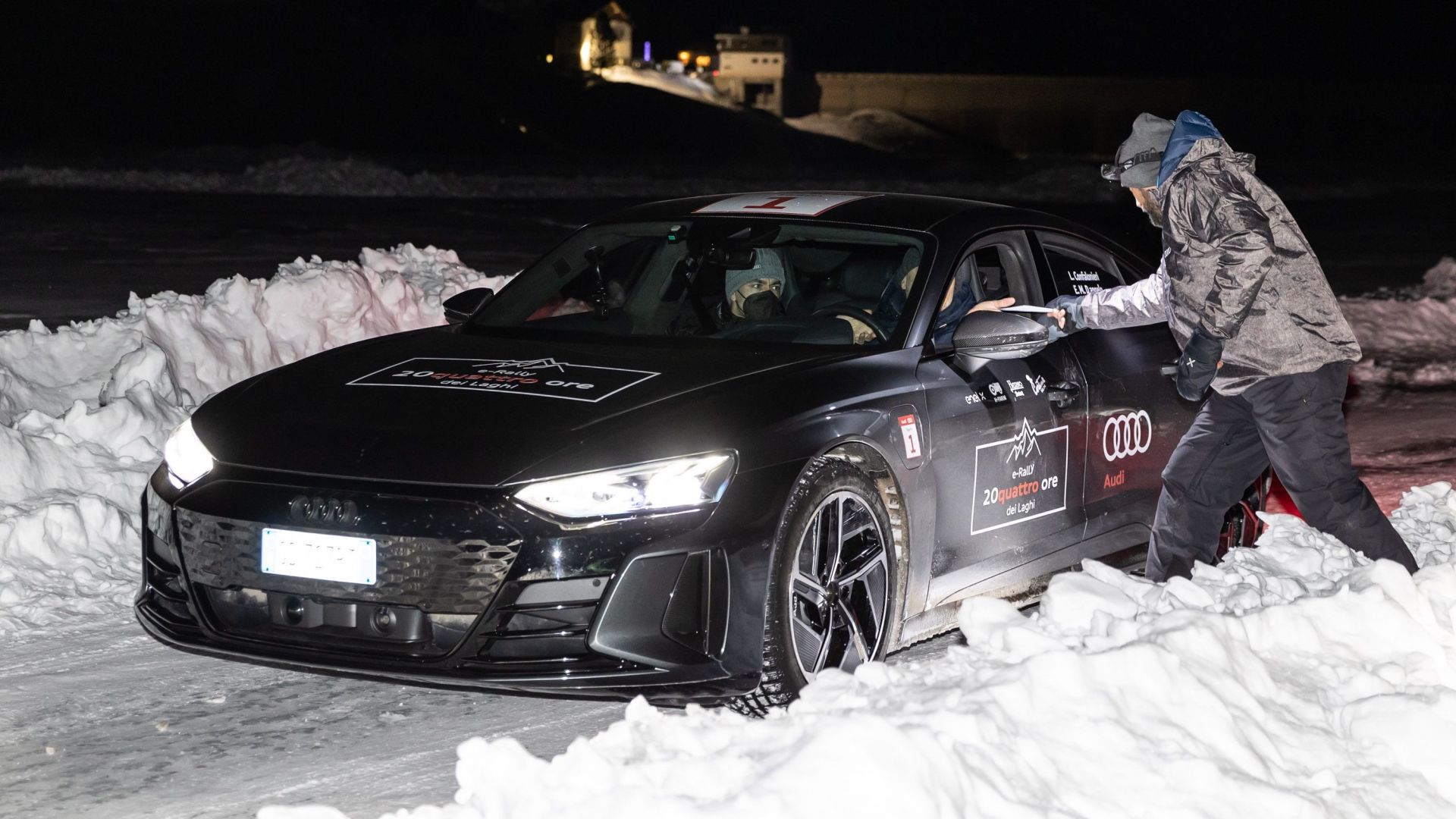 Pronti al via, un giro di ricognizione e scatta il cronometro. È un bel pistino dove si alternano curve in cui è meglio fare spettacolo e mettersi di traverso e altre in cui tagliare puliti e abbottonati è più redditizio. Per mettermi di traverso con la coppia della RS e-tron GT è un attimo e, malgrado massa e dimensioni, la coda rimane sempre controllabile con facilità, nei traversi e nei controtraversi per fare il pendolo e prepararmi alla curva successiva. Franco, ex rallysta che trascorre gli inverni sulle piste ghiacciate dispensa dritte e buoni consigli per migliorare la mia guida. Dopo quattro giri la giostra finisce e il bambino Mario ritira il cartellino dei tempi: “Complimenti! Al momento il tuo è il miglior tempo assoluto”.
