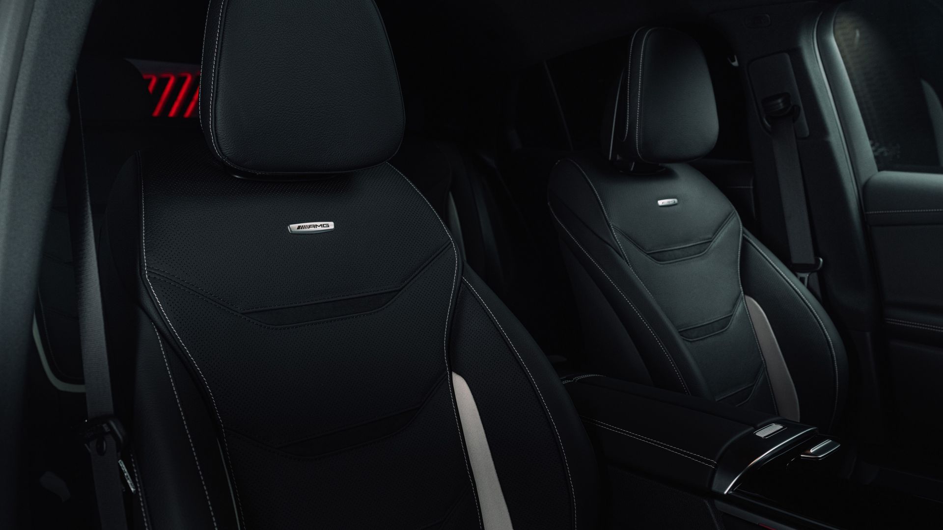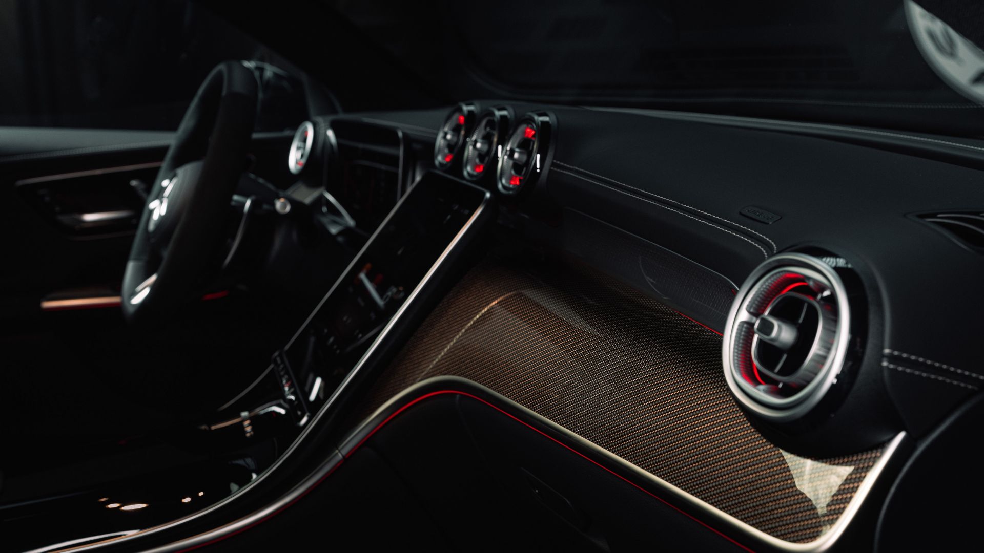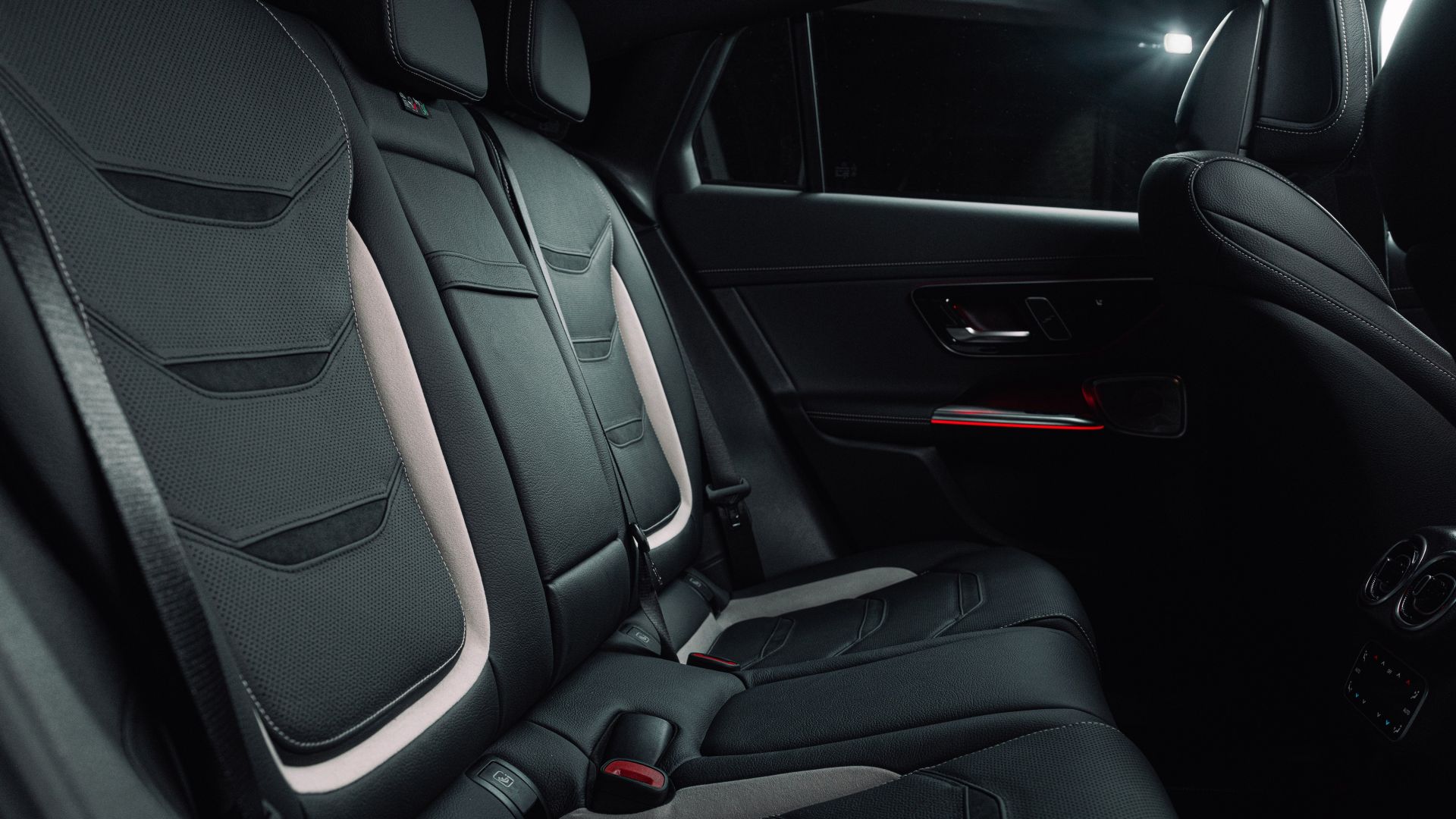 All’interno, sedili sportivi AMG in pelle nera con cuciture a contrasto, inserti in carbonio intrecciati con fili metallici e battitacco illuminati completano un ambiente sportivo ma raffinato, in perfetto stile Affalterbach.