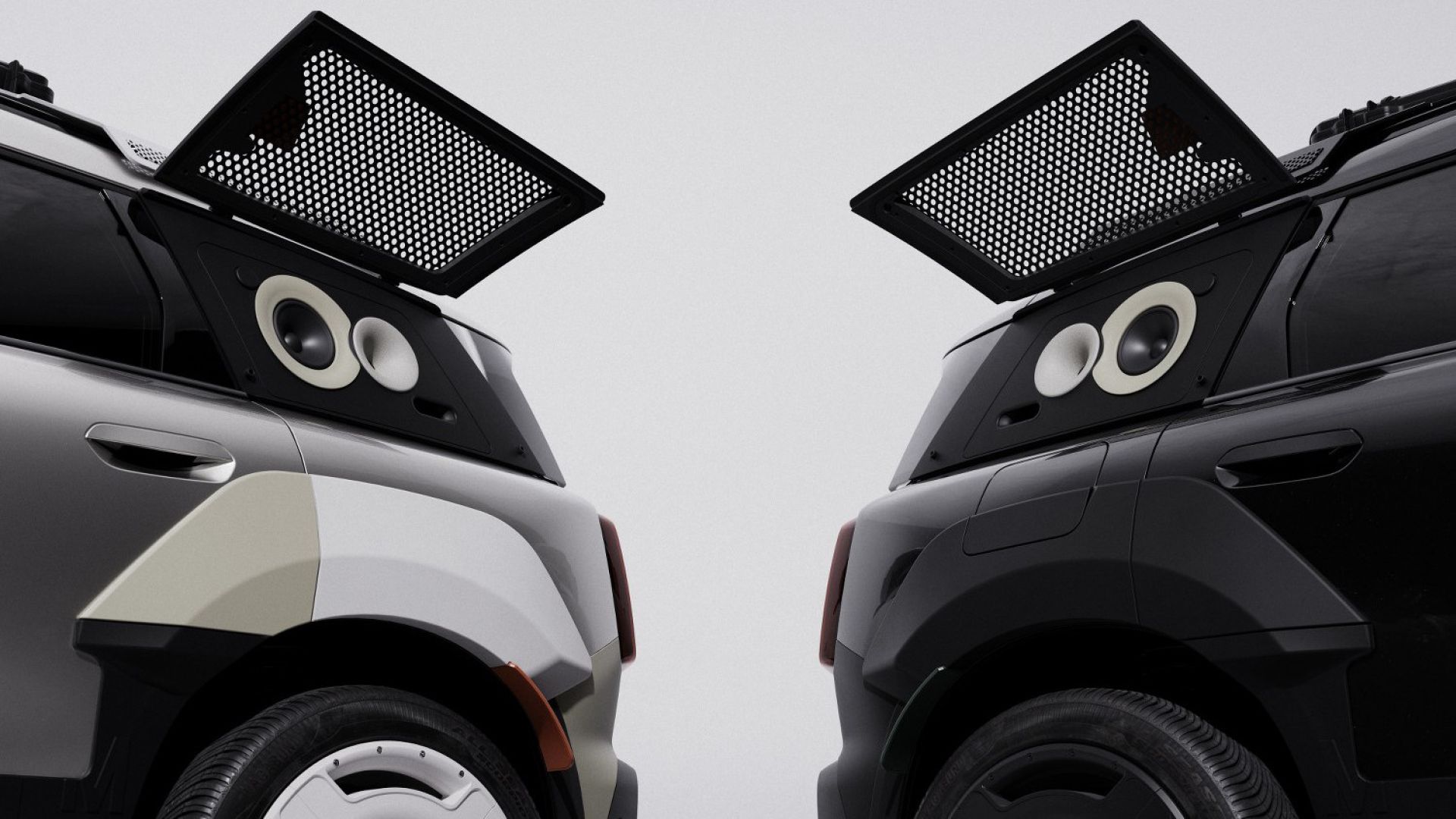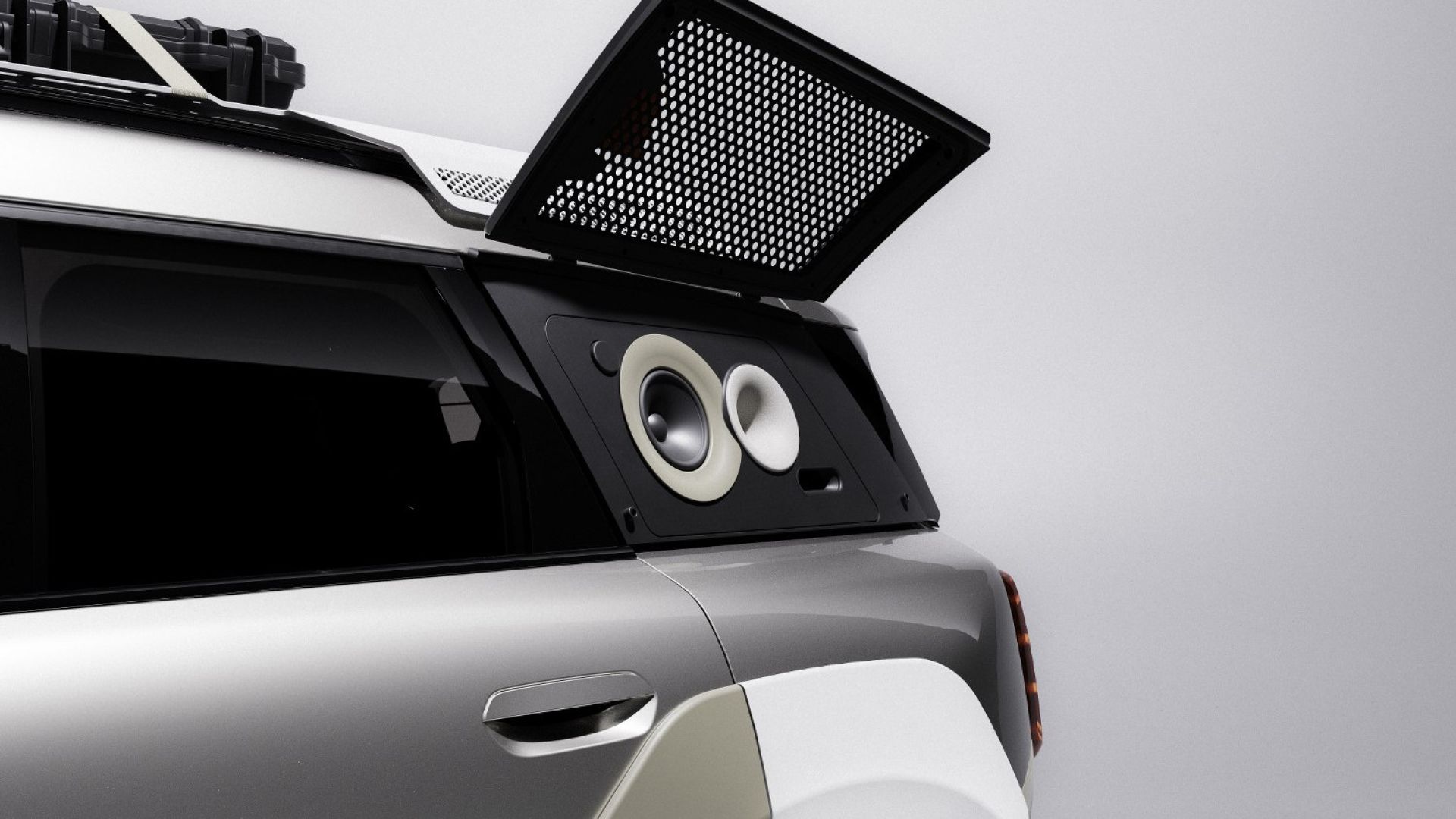 Ma veniamo alla caratterizzazione più particolare di queste due one-off. I finestrini posteriori sono stati rimossi e al loro posto troviamo un impianto audio progettato appositamente per la diffusione del suono all’aperto. L'alloggiamento per gli altoparlanti è realizzato in granito polimerico fuso, un materiale che secondo MINI offre le condizioni ideali per una riproduzione sonora precisa e priva di distorsioni. La dotazione audio include pure Tweeter e altoparlanti mid-range integrati direttamente nella carrozzeria. Inoltre, sono pure presenti ulteriori subwoofer nella parte posteriore.