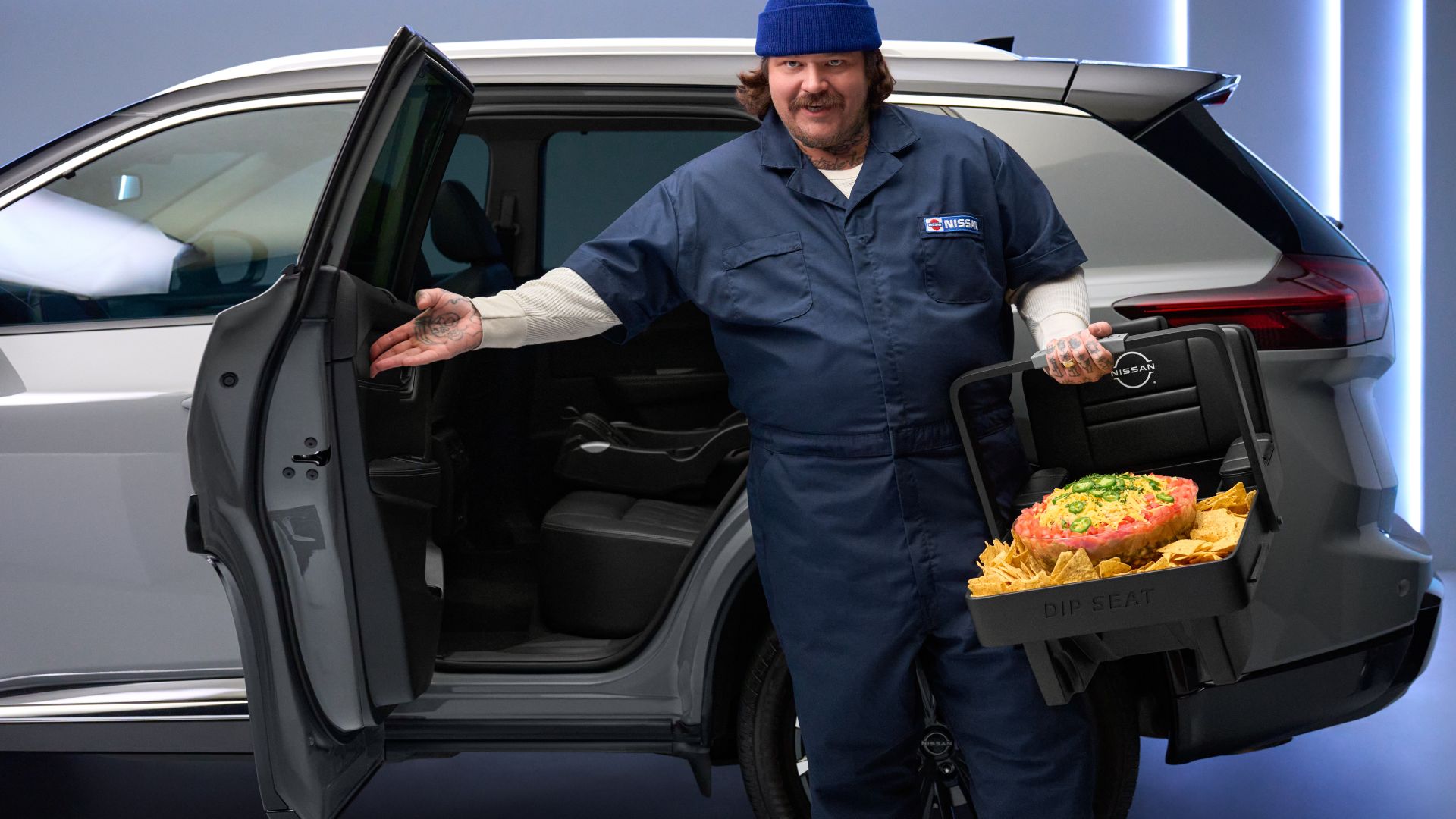 Ecco, Nissan ha risolto il problema con il ''Dip Seat'', un seggiolino protettivo, con tanto di attacchi LATCH (il nostro Isofix), studiato appositamente per tenere in cassaforte una ciotola di crema al formaggio e jalapeños.