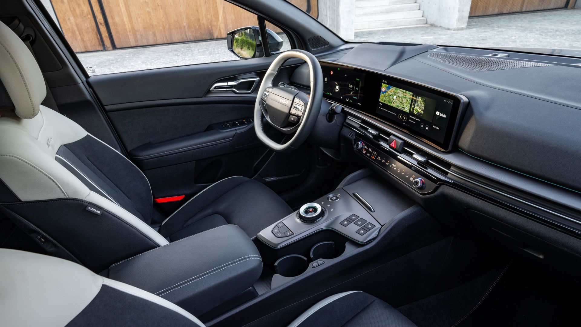 Dentro (in attesa di qualche fotina dedicata, eh Kia?), doppio display da 12,3”, cielo nero e sedili in Kia tex Delight (traduzione: finta pelle fatta bene).