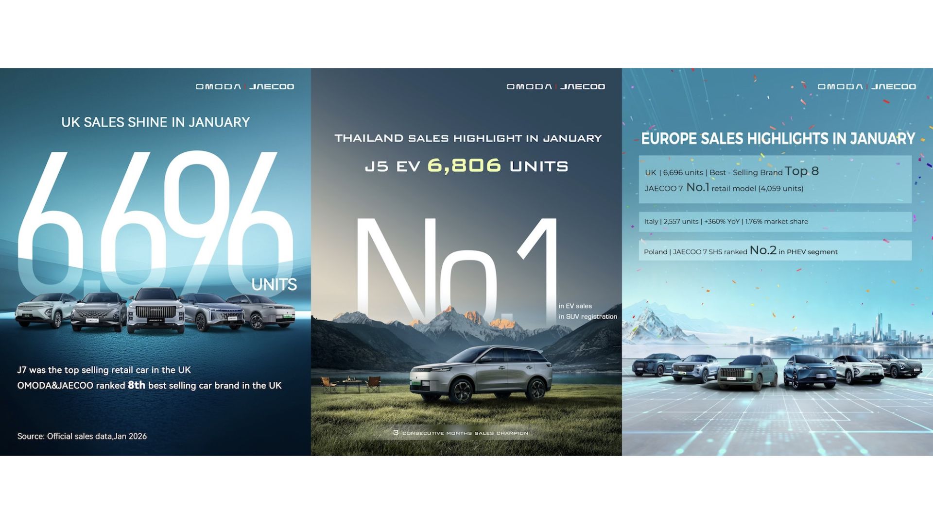 Concentrandoci nel Vecchio Continente, Omoda & Jaecoo sta accelerando la sua crescita grazie a una gamma sempre più completa che può contare sulla tecnologia SHS Super Hybrid per offrire veicoli Full Hybrid e Plug-in Hybrid. In due anni dall'arrivo in Europa, il marchio ha venduto oltre 220 mila auto. Ad esempio, nel Regno Unito, Omoda & Jaecoo ha superato il 2% di quota di mercato in soli nove mesi ed è entrato nella top ten delle vendite in 17 mesi.