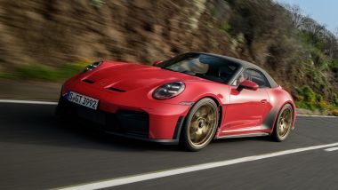 Altri dettagli che caratterizzano il nuovo gioiello della casa automobilistica tedesca, la cornice del parabrezza in nero, i fari a LED con tecnologia Matrix e per la prima volta su di una 911 Cabriolet, lo spoiler posteriore retraibile presenta un flap di Gurney in coda, come troviamo sulla 911 S/T e sulla 911 GT3 con pacchetto Touring. La dotazione di serie prevede anche cerchi con serraggio centrale da 20 pollici sull'asse anteriore e da 21 pollici su quello posteriore realizzati in magnesio ultraleggero (pneumatici anteriori 255/35 ZR 20 e posteriori 315/30 ZR 21). Per la sportiva, Porsche ha adottato materiali particolarmente leggeri per contenere il più possibile il peso (1.497 kg). Ad esempio, il cofano anteriore, i parafanghi e le portiere sono realizzati in CFRP.
