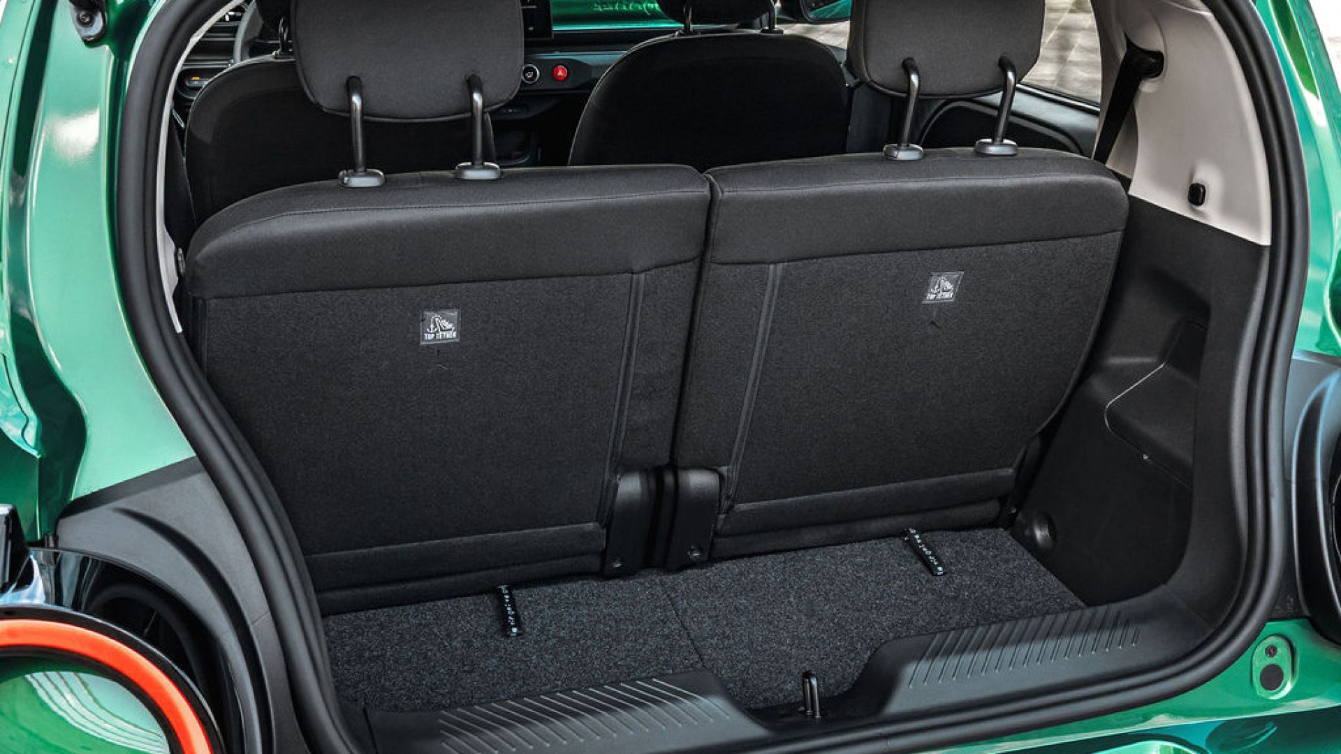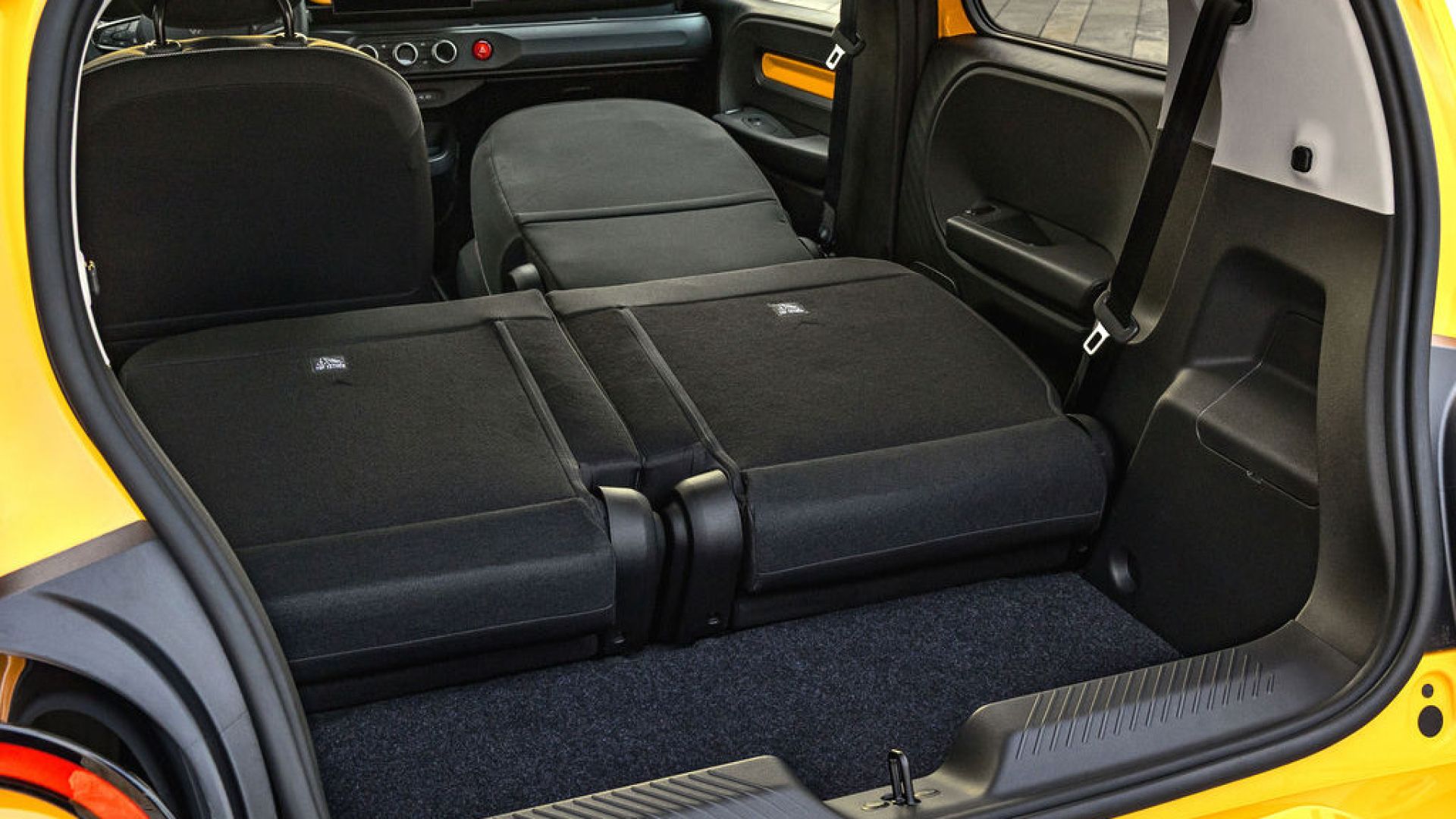 Il divanetto posteriore diviso 50:50 scorre di 17 cm come sulla vecchia Twingo per avvantaggiare gambe dei passeggeri o bagagliaio che, con un volume da 260/1.010 litri (a cui si aggiungono i 50 litri del doppio fondo per il cavo di ricarica con due furbe aperture separate), sembra un piccolo prodigio per una segmento A. Infine, gli schienali reclinabili su tre posizioni o del tutto (sulla Techno anche quello anteriore destro), permettono di caricare oggetti lunghi fino a due metri, rendendo la Twingo E-Tech Electric una perfetta tuttofare.
