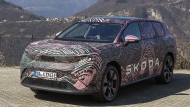 Il SUV disporrà di portiere con maniglie a filo della carrozzeria e guardando di profilo notiamo la linea del tetto che termina con uno spoiler dove è integrata la terza luce di stop. Il camuffamento al posteriore non permette di vedere bene i dettagli ma i gruppi ottici dovrebbero presentare una firma luminosa a forma di T come all'anteriore. Complessivamente, le forme del nuovo SUV appariranno particolarmente massicce. Nelle foto condivise da Skoda non si vedono gli interni. Tuttavia, possiamo immaginare la presenza della strumentazione digitale e di un ampio display per l'infotainment. Lo stile non dovrebbe essere eccessivamente minimalista dato che dovrebbero essere presenti alcuni comandi fisici per le principali funzioni dell'auto.