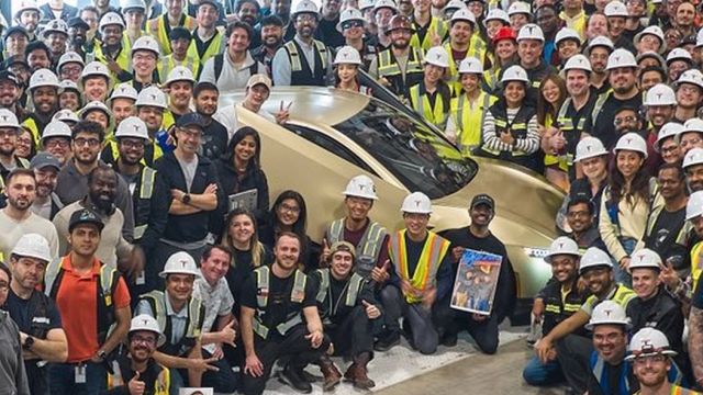 Ed ecco il primo Tesla Cybercab uscire ufficialmente dalle linee di montaggio della Giga Texas. Foto celebrativa, Musk che posta su X, i fan che gridano al futuro.