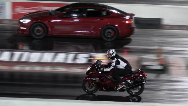 Prima maturanda è una Tesla Model S Plaid color bordeaux, berlina elettrica da quasi 1.100 cv che Tesla sta per mandare in pensione per fare spazio ai robot Optimus, che nessuno ha ancora capito se vuole davvero in casa. Dall'altra parte della linea di partenza, due Suzuki Hayabusa GSX1300R, leggenda vivente delle moto sportive.