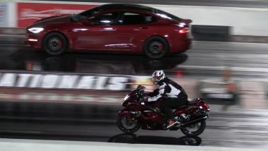 Gara-2: il proprietario della Plaid, evidentemente convinto di aver trovato la formula magica, accetta la sfida di una seconda Hayabusa. Solo che, stavolta, il motociclista sa esattamente cosa sta facendo. Risultato: 9,43 secondi per la Suzuki, 9,81 per la Tesla. L'auto va più forte di prima, ma non basta. La scuola è finita, e oggi il professore aveva la moto.