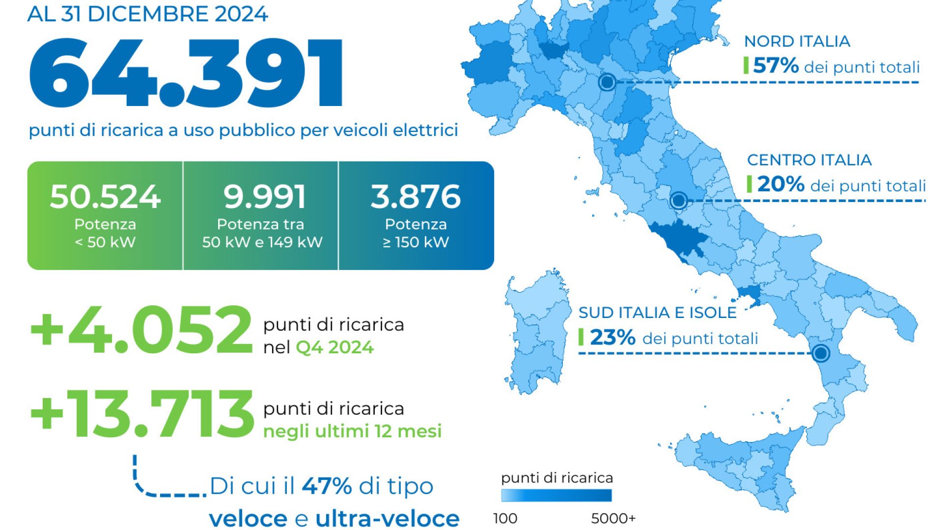 Calcola un report Motus E (vedi infografica sotto) che al 31 dicembre 2024, sulle autostrade italiane, i punti di ricarica si attestano a 1.087 unità. Una tabella mostra la costante evoluzione della rete.