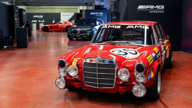 LA PRIMA DELLA STIRPE Tante auto vendute e tanti appassionati pronti a ritrovarsi in pista in occasione degli AMG Performance Day, perché la pista fa parte della storia del AMG, come quando nel 1971 A(ufrecht) e M(elcher) riscossero il loro primo vero successo con la Rote Sau, la scrofa rossa come era amabilmente soprannominata la improbabile berlinona 300 SEL equipaggiata con un V8 6.8 AMG che vinse la 24h di Spa nella sua classe, piazzandosi seconda assoluta.