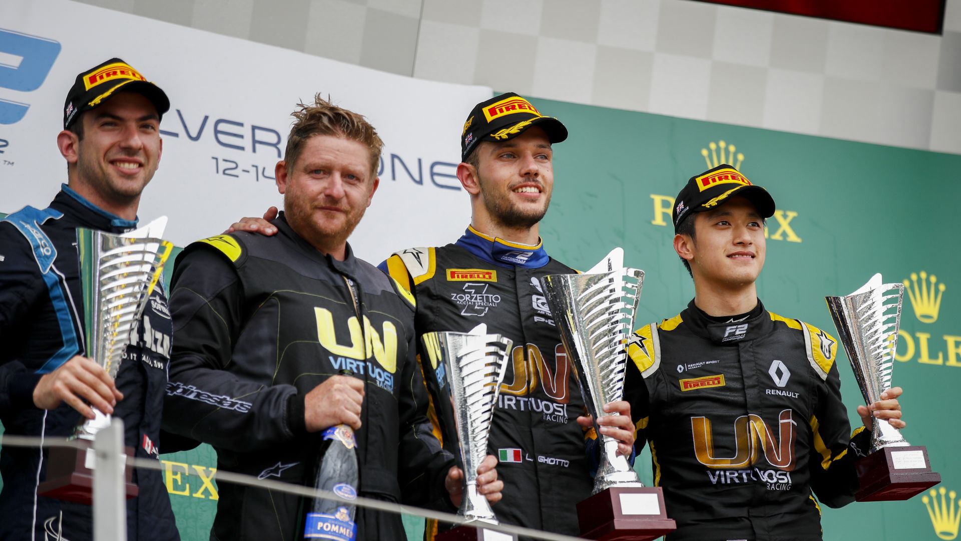 DUELLO VINCENTE Due i momenti decisivi che hanno consentito a Luca di sfatare finalmente il tabù della Feature Race. Il primo proprio allo spegnimento dei semafori, con Ghiotto bravo a infilare Zhou già all’interno in curva-1. Sotto un cielo costantemente minacciante pioggia, il secondo episodio determinante è stato proprio dopo la sosta obbligatoria: il pilota del team Uni-Virtuosi è infatti uscito dai box davanti a Nicholas Latifi, il quale ha però sfruttato le gomme già calde per prendersi la prima posizione virtuale (davanti c’erano infatti Mazepin, Calderon e Raghunathan, che dovevano però ancora fermarsi ai box). Al termine di un duello entusiasmante, Ghiotto è però riuscito a riprendersi la leadership grazie a un sorpasso spettacolare all’interno della mitica curva Stowe.