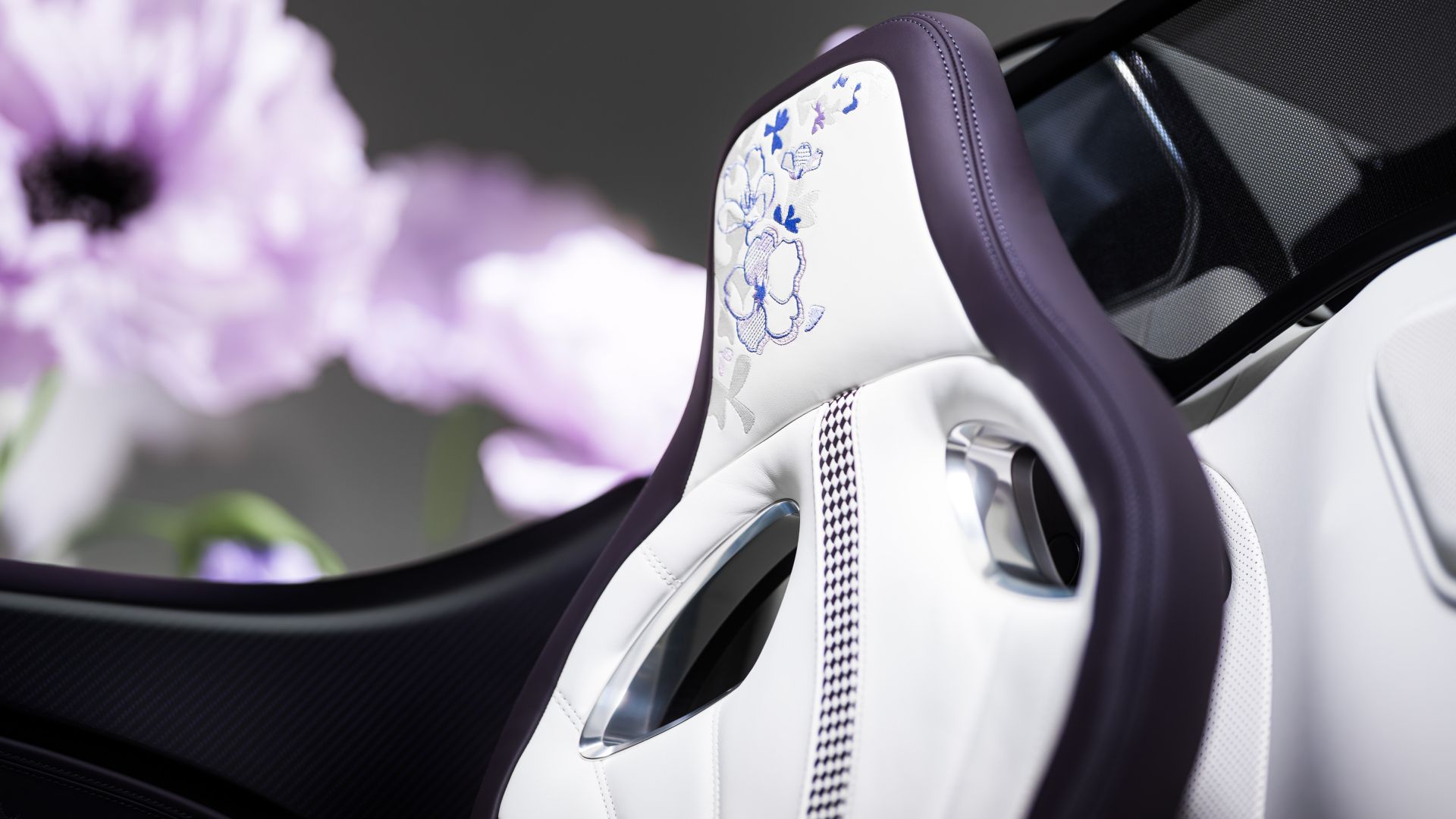 All'interno, l'atmosfera vira verso l'eleganza assoluta. Pelle nelle tonalità ''Blanc'' e ''Minuit'', con ricami floreali sui poggiatesta che sembrano quasi tridimensionali, grazie a migliaia di punti di cucitura sovrapposti.