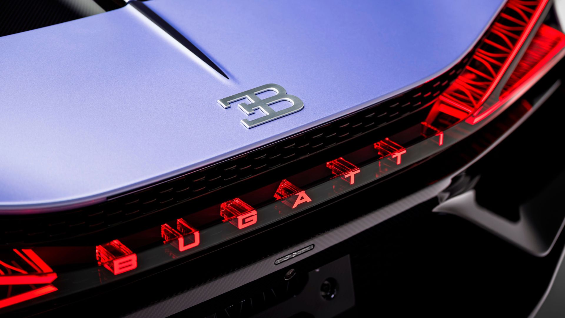 Al centro, la firma ''Caroline'' nel font ufficiale Bugatti. Un lavoro che ha richiesto ore di mascheratura e verniciatura multistrato, visibile in tutto il suo splendore solo quando l'air brake entra in azione durante le staccate più violente.