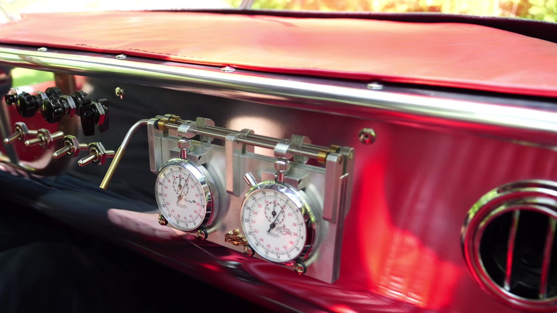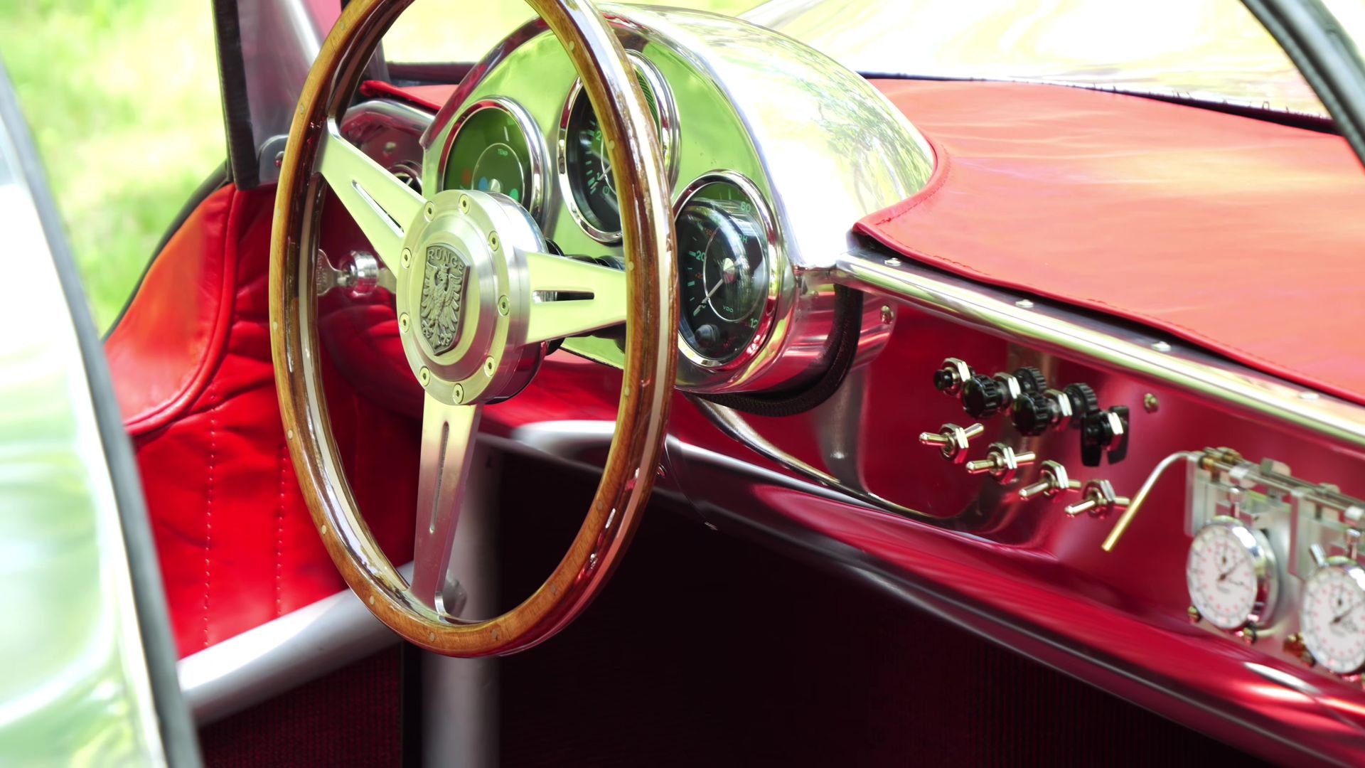 La chicca è la coppia di cronometri per le gare di regolarità e i rally: con una leva dotata di camme - anch'essa fatta a mano - che consente di azionarli entrambi contemporaneamente. I finestrini? Fissi. L'aria entra da bocchettoni circolari ricavati nel lexan.