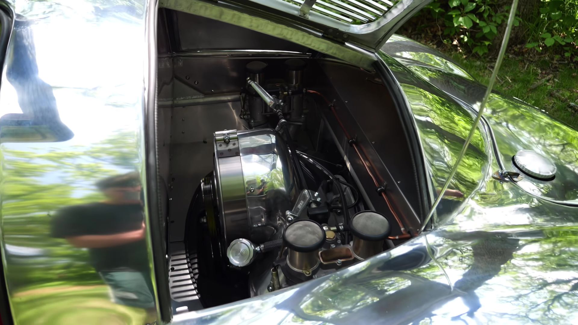 Al vano motore si accede tramite due sportelli che si aprono ad ali di gabbiano, come le porte. Dentro, una campana in alluminio realizzata a mano convoglia l'aria della ventola per controllare le temperature del boxer 4 cilindri raffreddato ad aria.